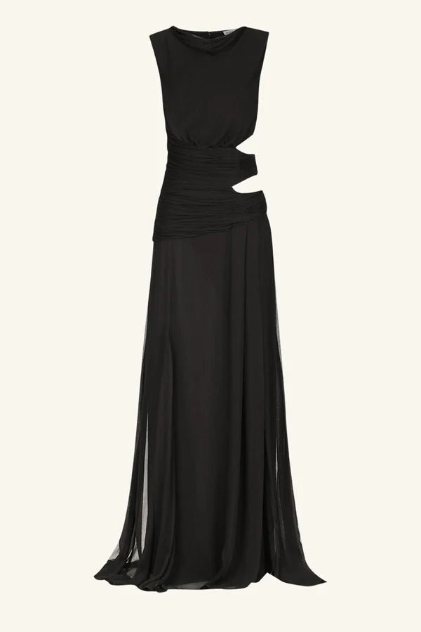 Cut out side split maxi dress in a light weight semi-sheer chiffon.