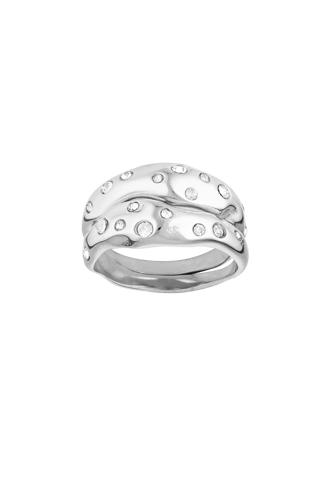 Featuring two abstract rings with cubic zirconia gem buttons throughout, glossy white gold plating and a sterling silver base.
