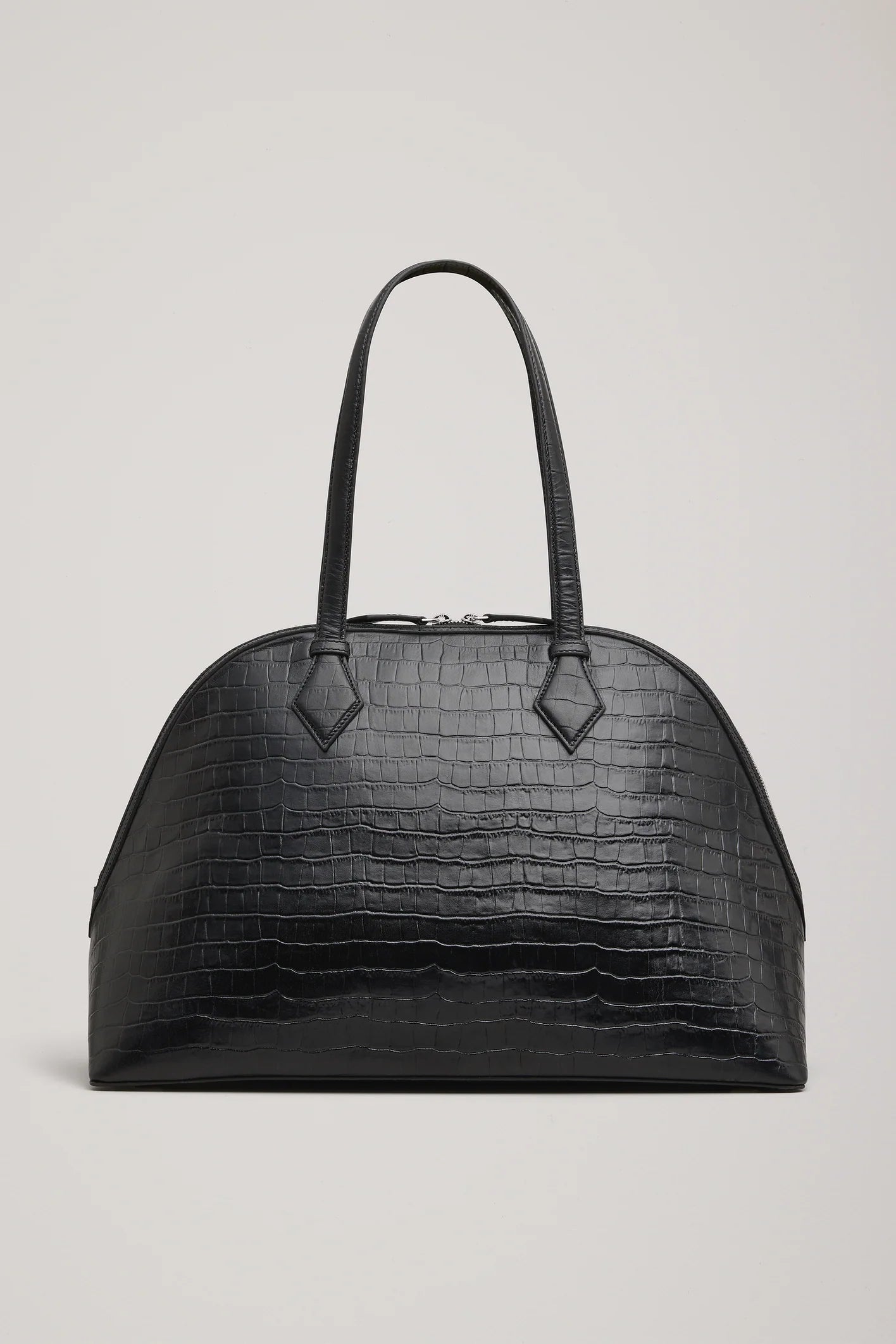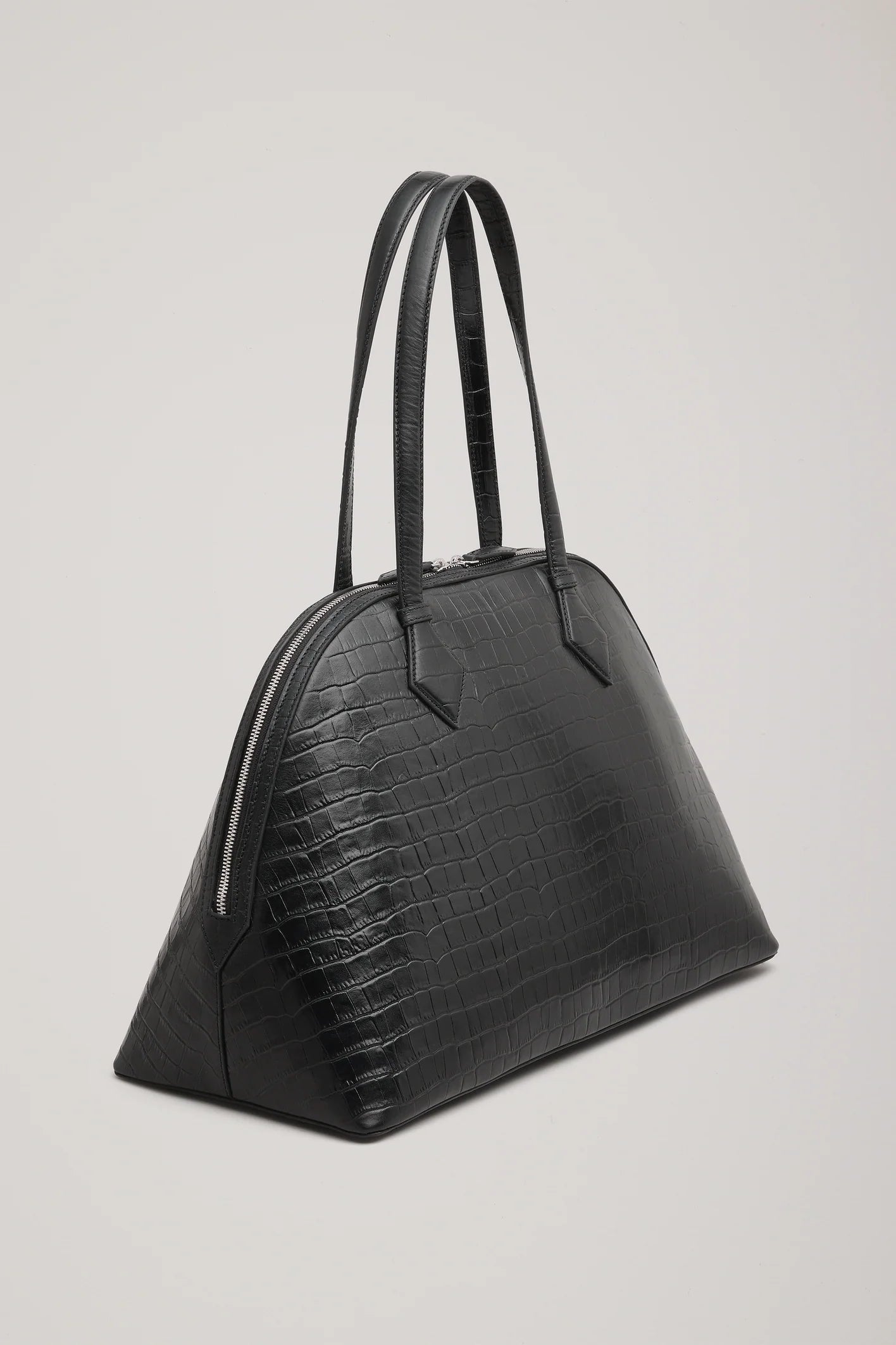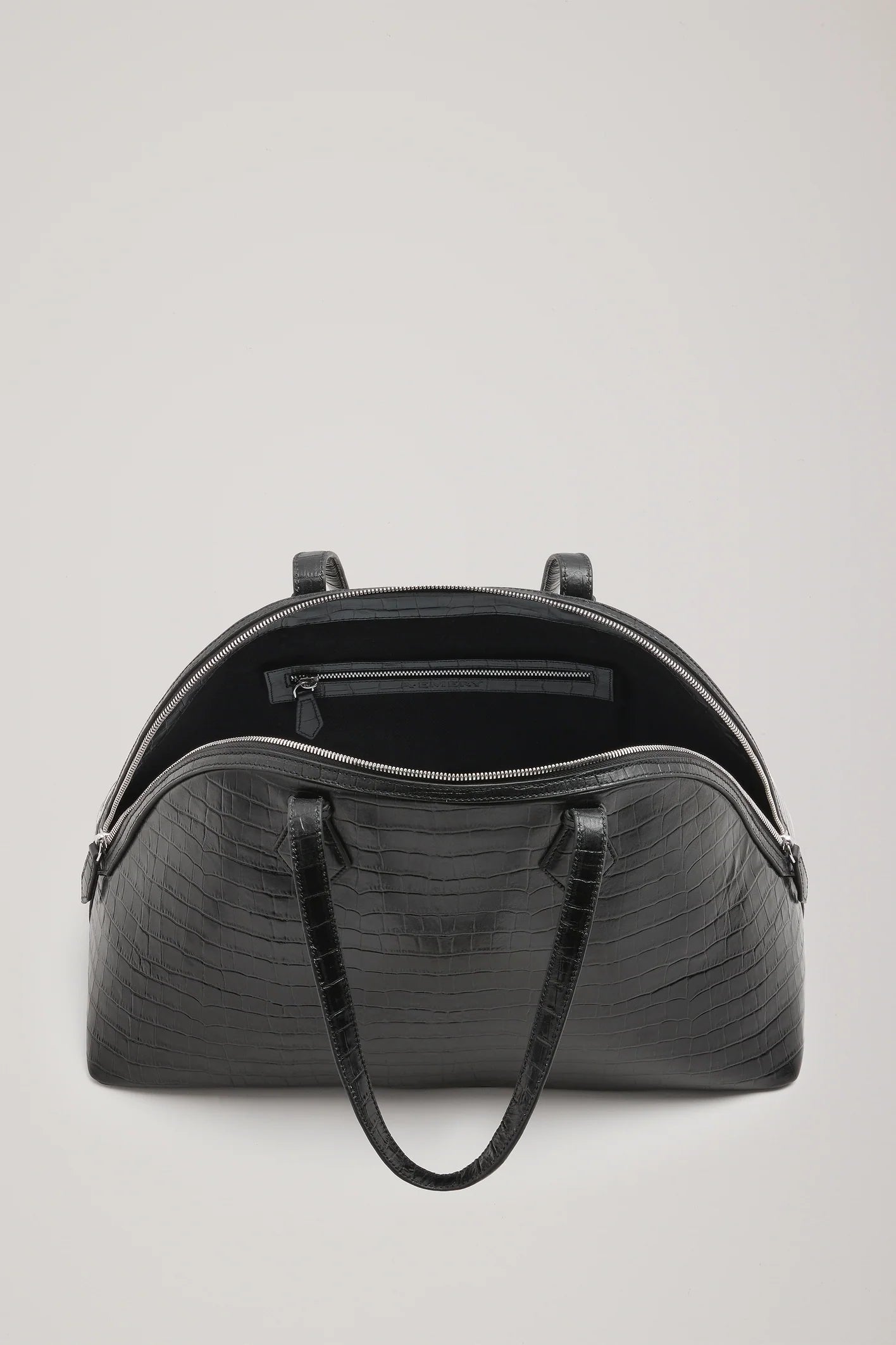 The Harnick Bag is crafted from premium croc embossed leather, defined by a sculptural tapered silhouette. Designed with functionality in mind, it features a two-way double zip closure, structured handles and four protective feet at the base. The interior is lined in a premium cotton twill and finished with a single internal zip pocket offering secure space for essentials.