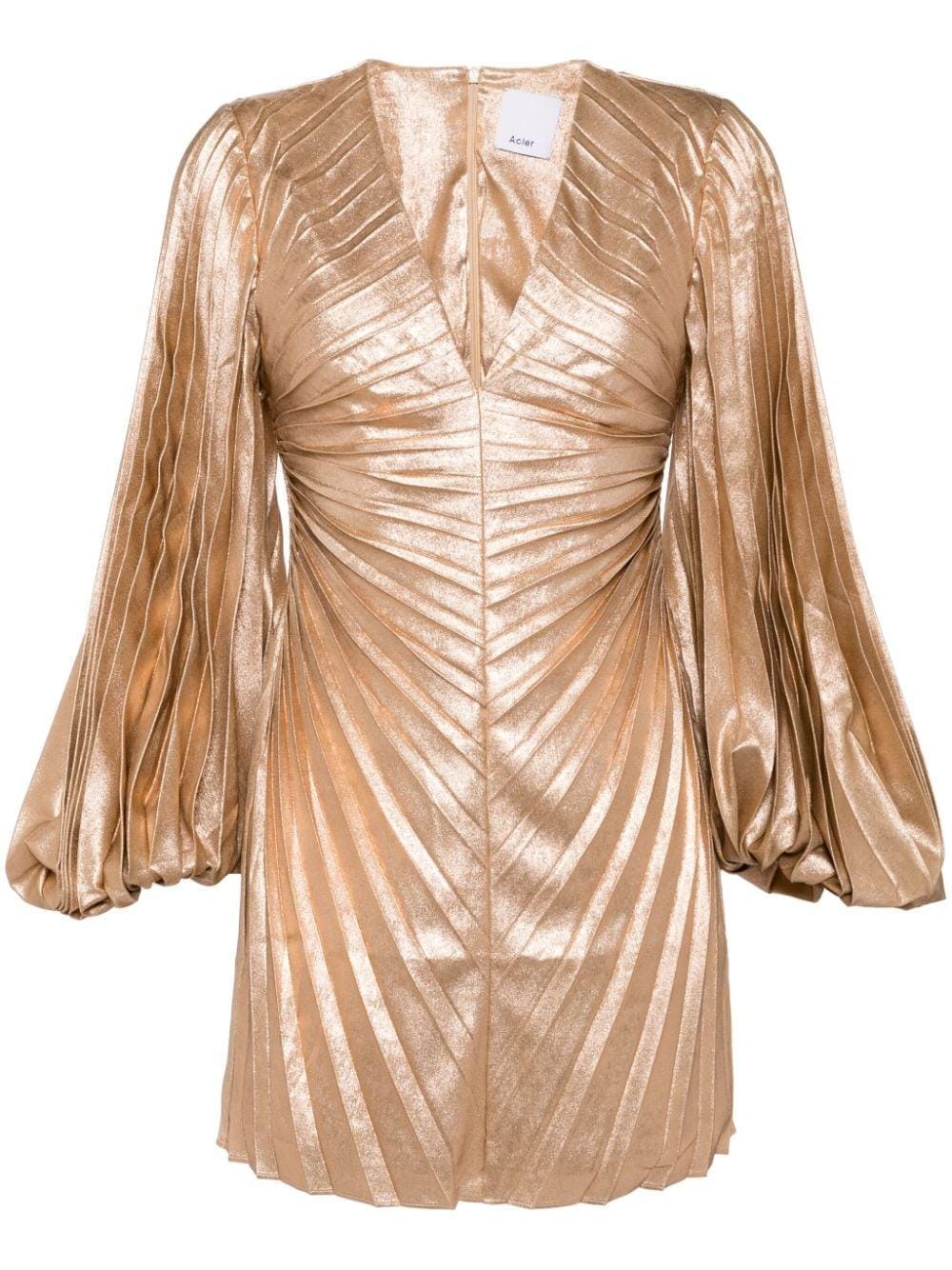 A stand out silhouette from the collection, crafted with the event season in mind. The Rothbury Mini Dress in Caramel Metallic is crafted from our signature pleated fabrication. Complimented with a v-neckline, accentuated full length sleeves and luxe gold hardware.