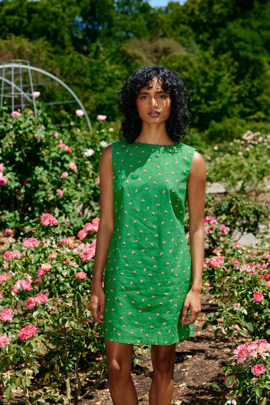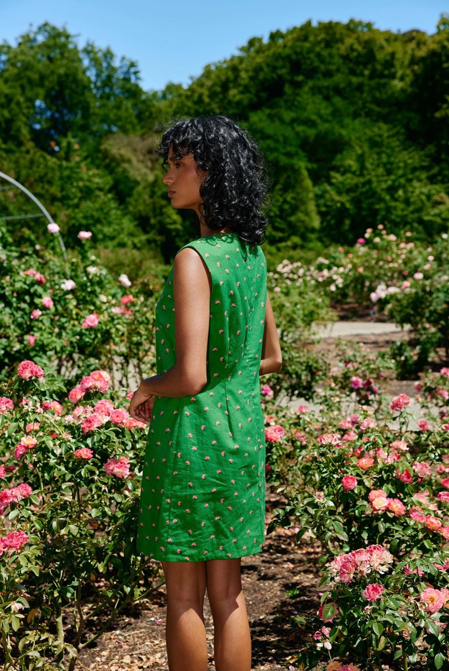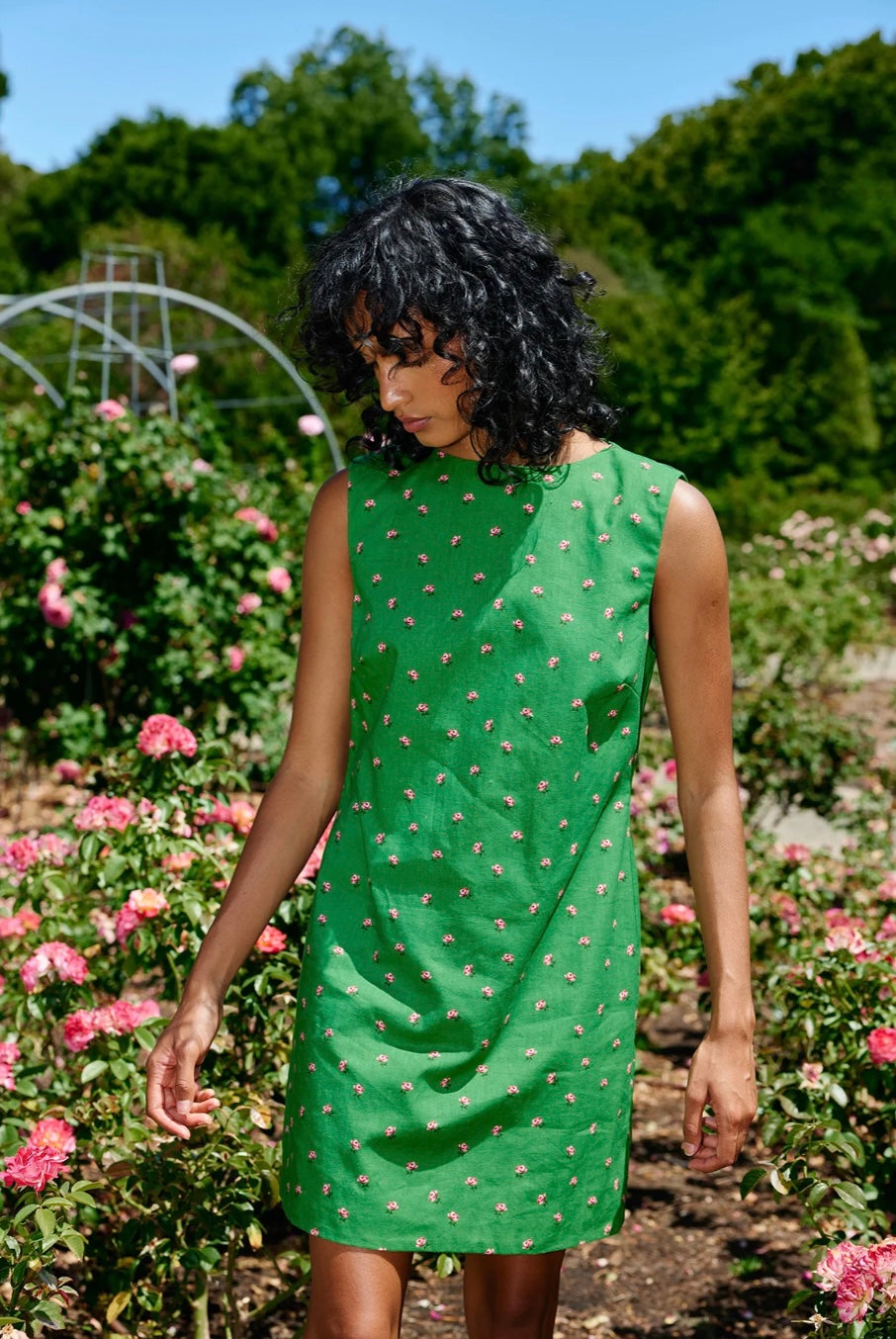 The Loelle Dress is a mini shift silhouette with a ditsy Leaf Rose print. Crafted with a soft, lightweight linen cotton blend the Loelle is an idyllic casual summer dress.