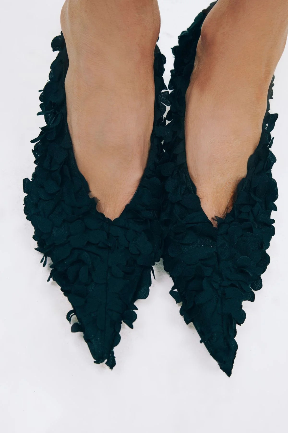 CAMILLA AND MARC Rhys black textured pointed pump. 3D cut fabric upper, nubuck leather sole. Made in Portugal.