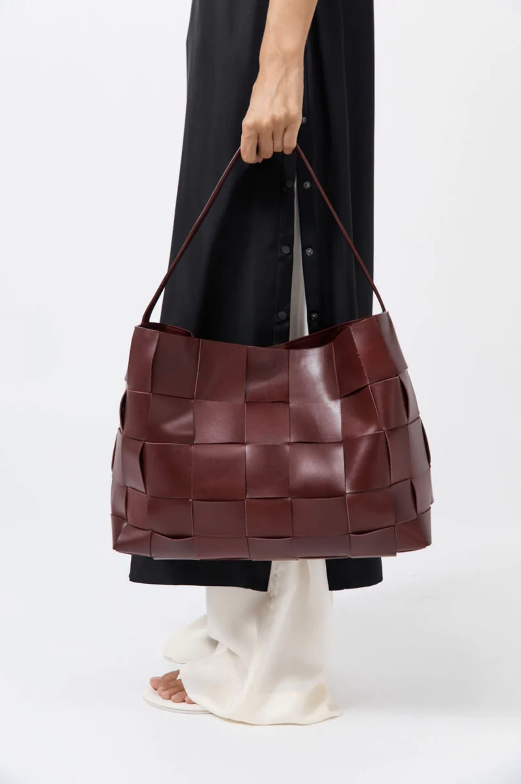 - Woven leather body, single shoulder strap, tote silhouette, internal pocket
