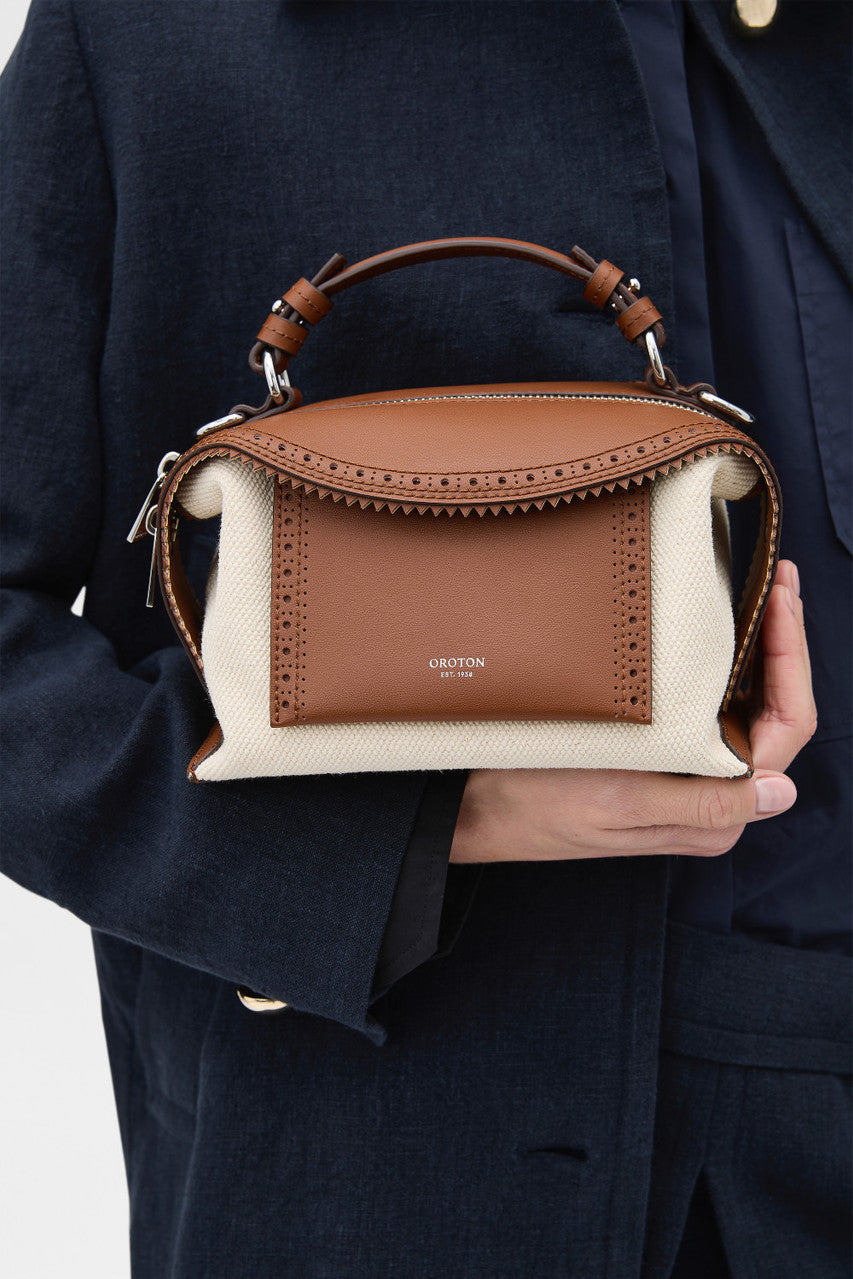 Oroton Mica Mini Bowler Canvas Broguing | Natural/Penny Brown (PRE-ORDER)