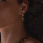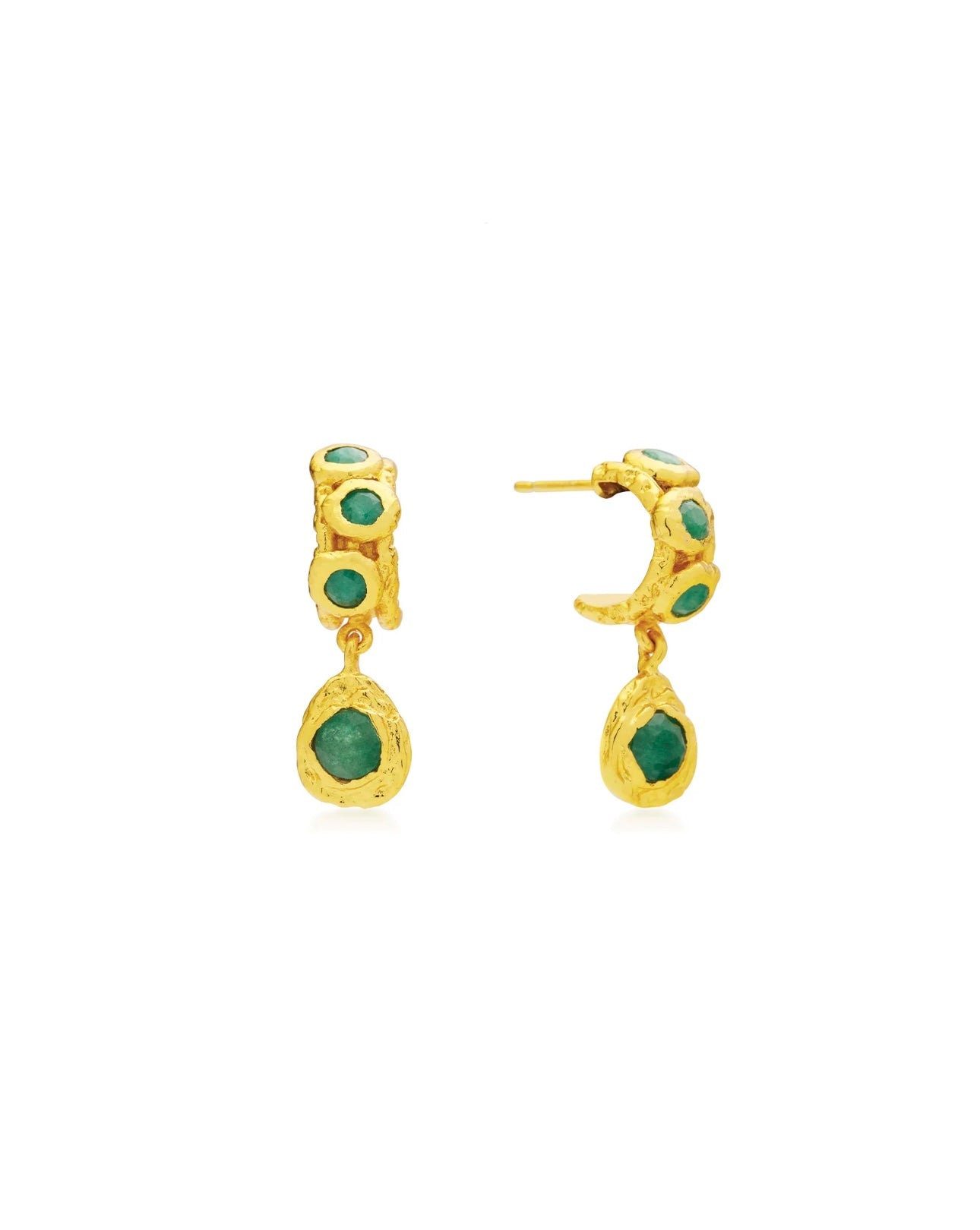 A contemporary take on a classis hoop, the Alanya Earrings are adorned with Beryl Emeralds encased in crushed 24K gold plating. Genuine semi-precious materials, please allow for natural variances in stones. Each piece is one of a kind.