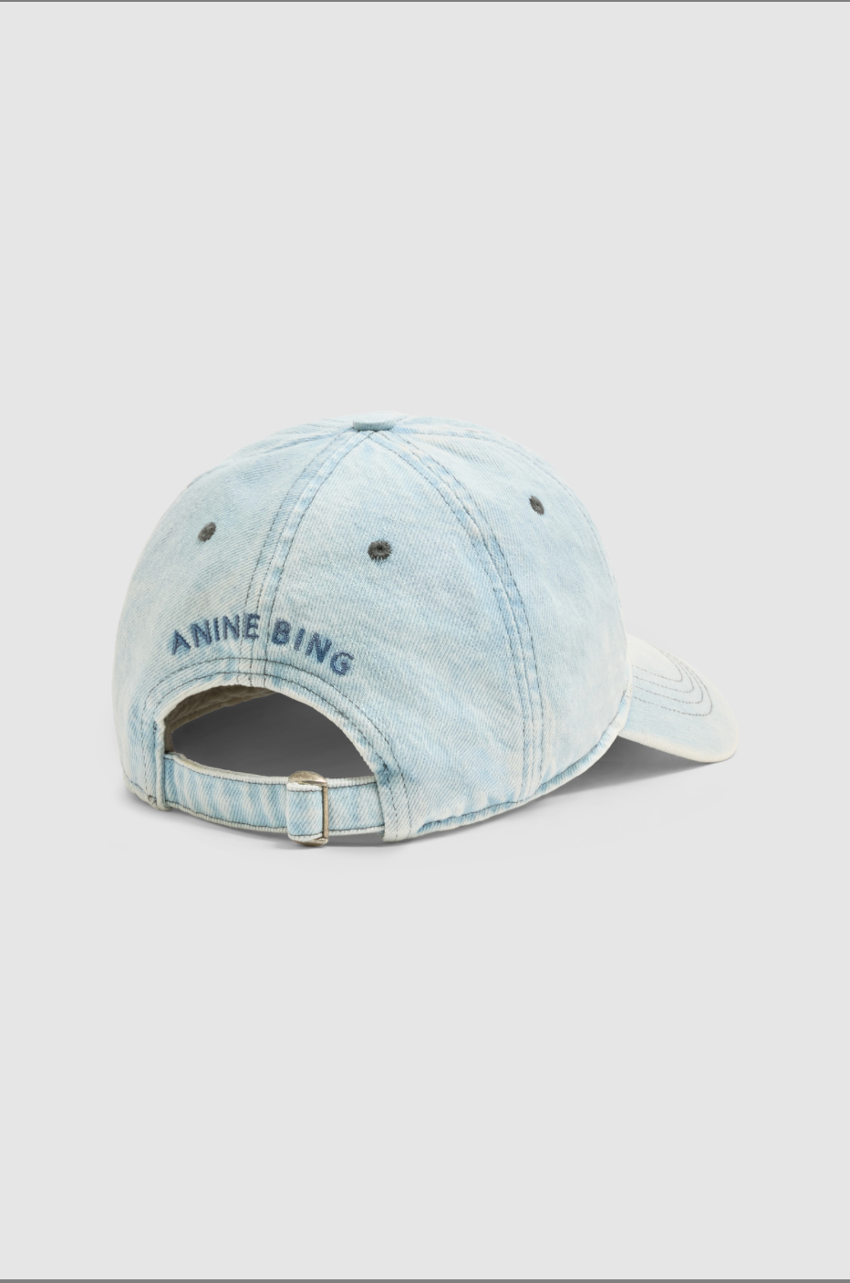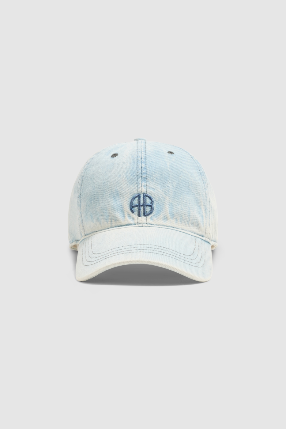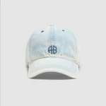 The Jeremy Baseball Cap AB is an everyday hat made from 100% regenerative cotton denim in a destructed bleached blue wash. It features an adjustable back strap for a close, comfortable fit. Finished with ivory satin stitch embroidery at the center front and back for a subtle touch of branding.