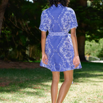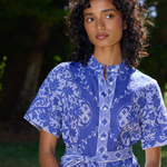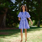 The Nami Dress in our Royal Antique floral embroidery print is a linen mini featuring button detailing and a self tie belt; offering a playful yet refined appeal.
