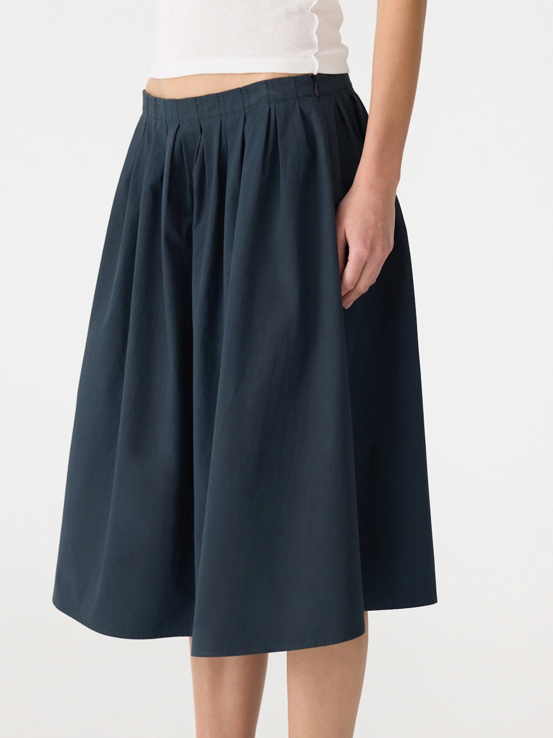 The Crushed Cotton Gathered Skirt is a mid-length pleated style crafted from lightweight compact cotton with a natural crushed texture. Designed with fine waist facing and inverted box tucks for volume and movement, finished with an invisible side zip closure and a raw hem for a relaxed edge.