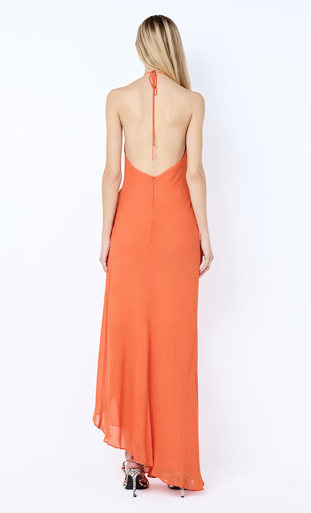 Sabrina Drape Maxi Dress in Persimmon. A georgette maxi dress with a wrapped V neckline that drapes at the side waist. Detailed with a cut-away leg split, low back and self neck ties for an elegant event look.