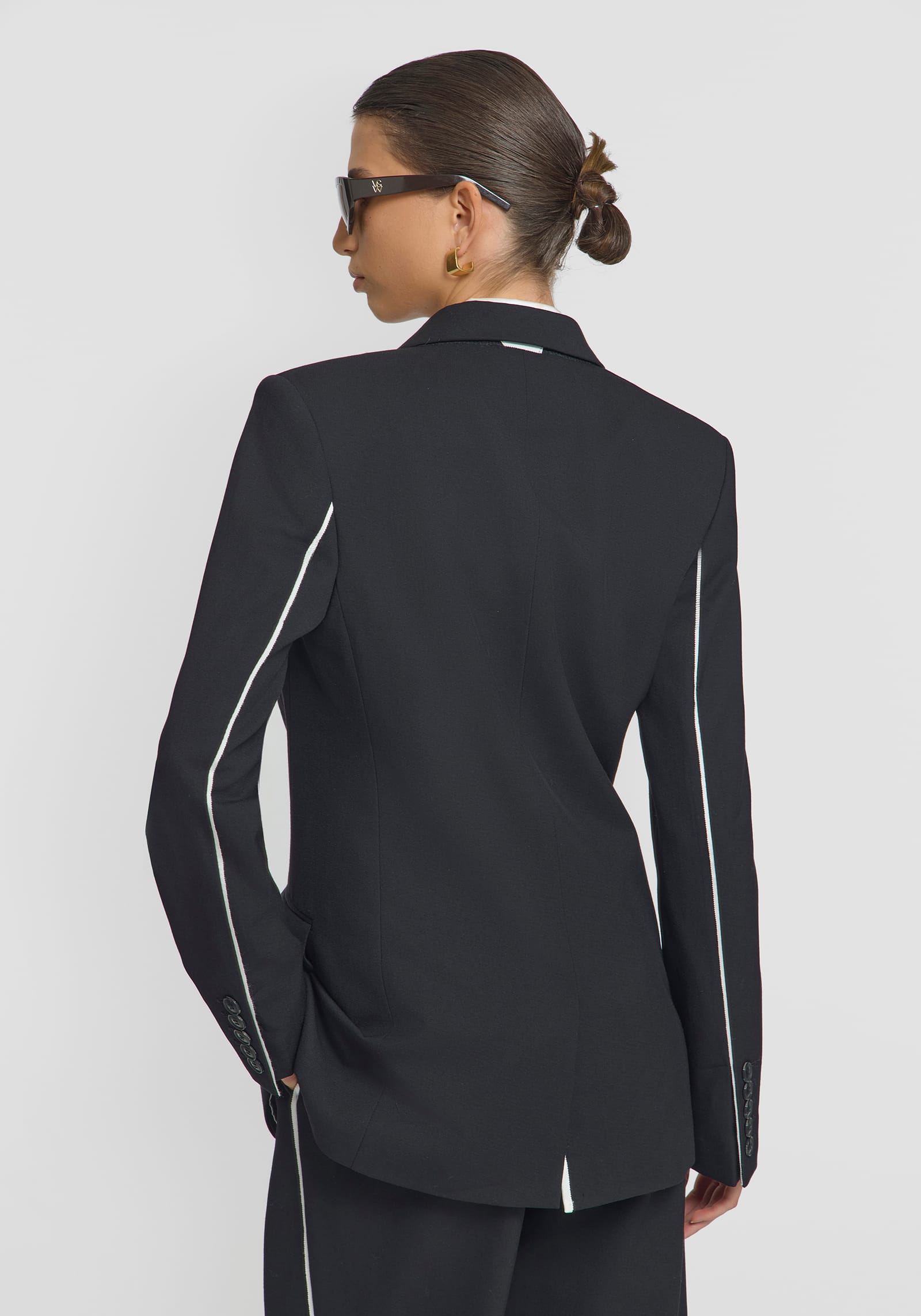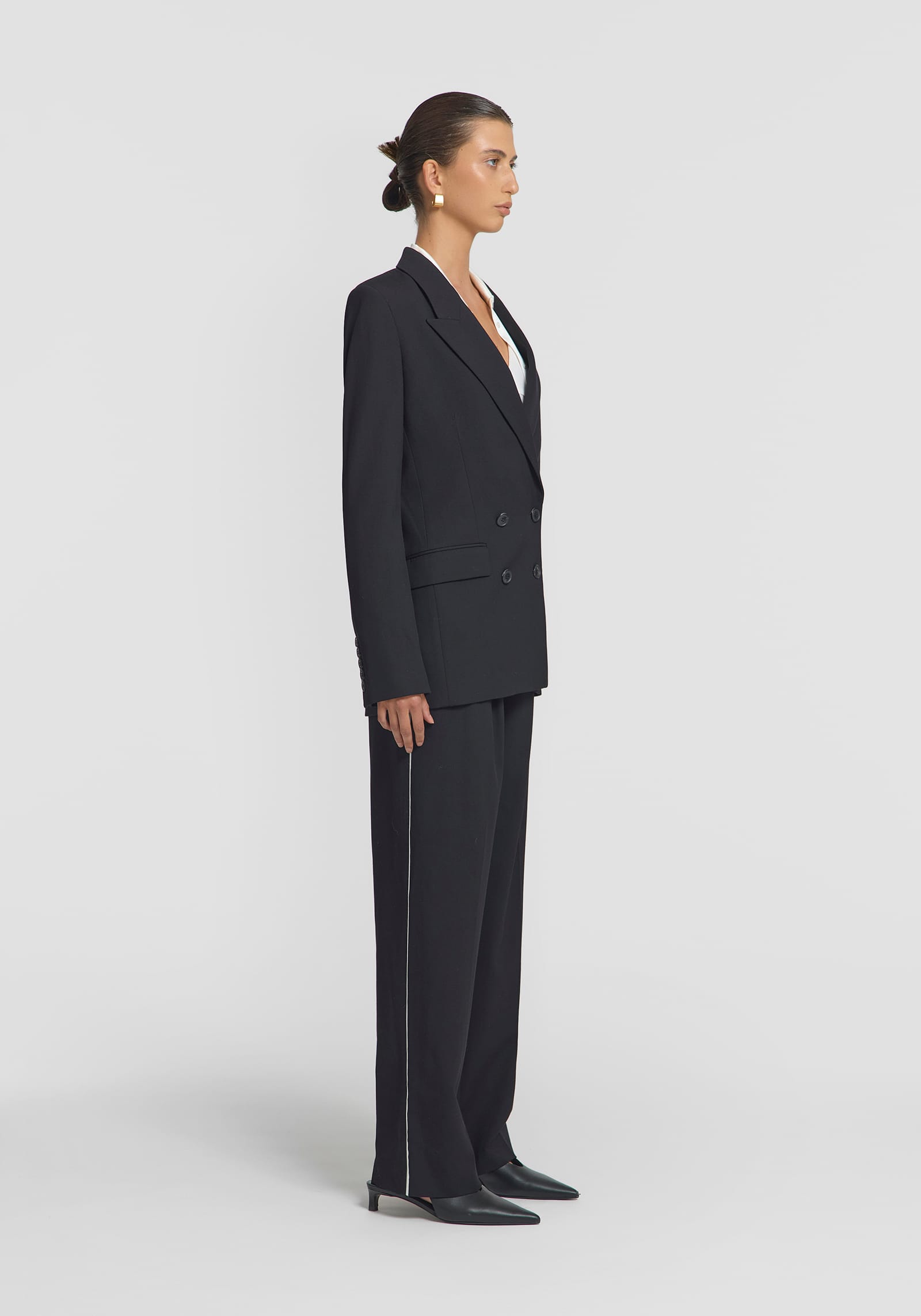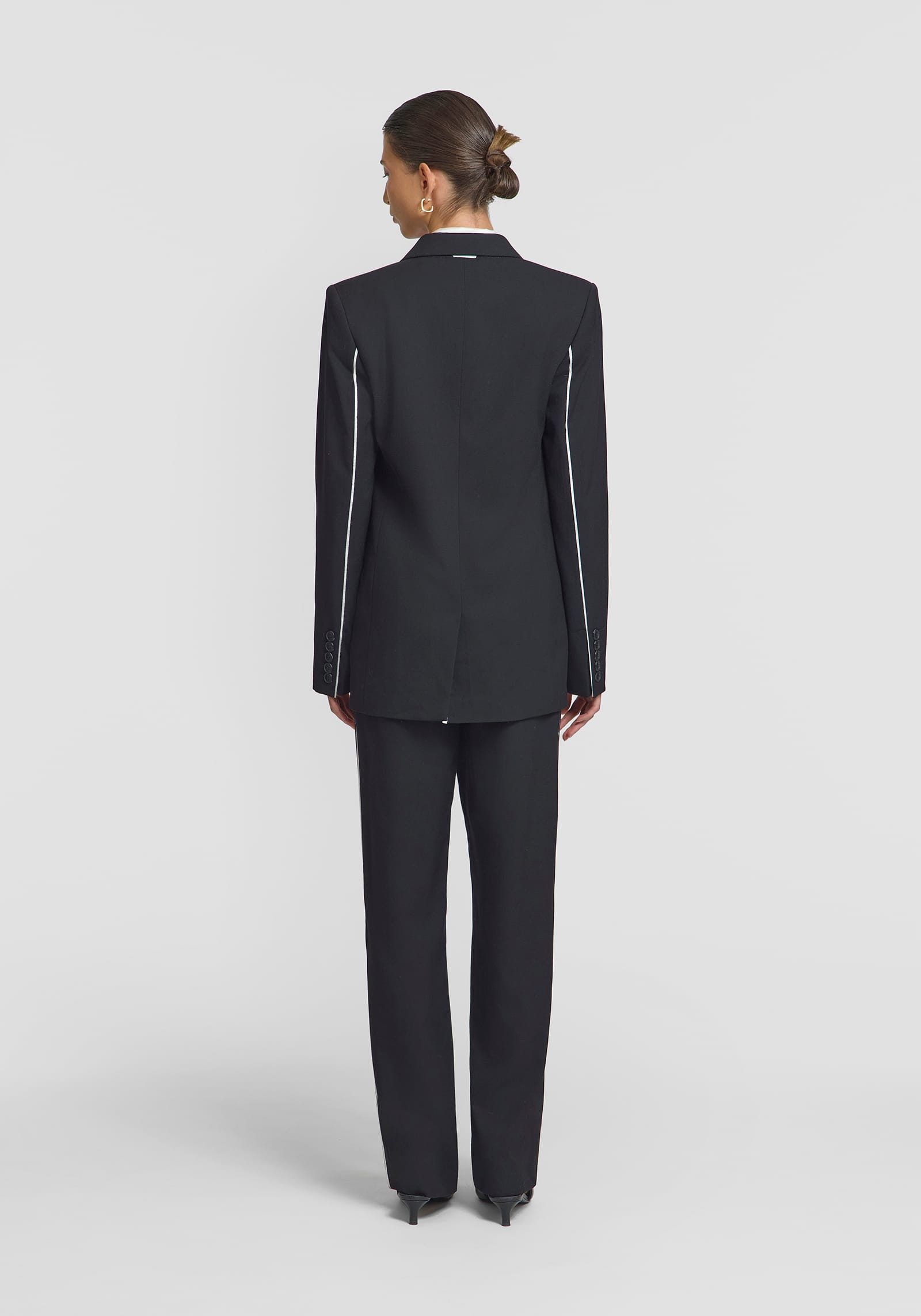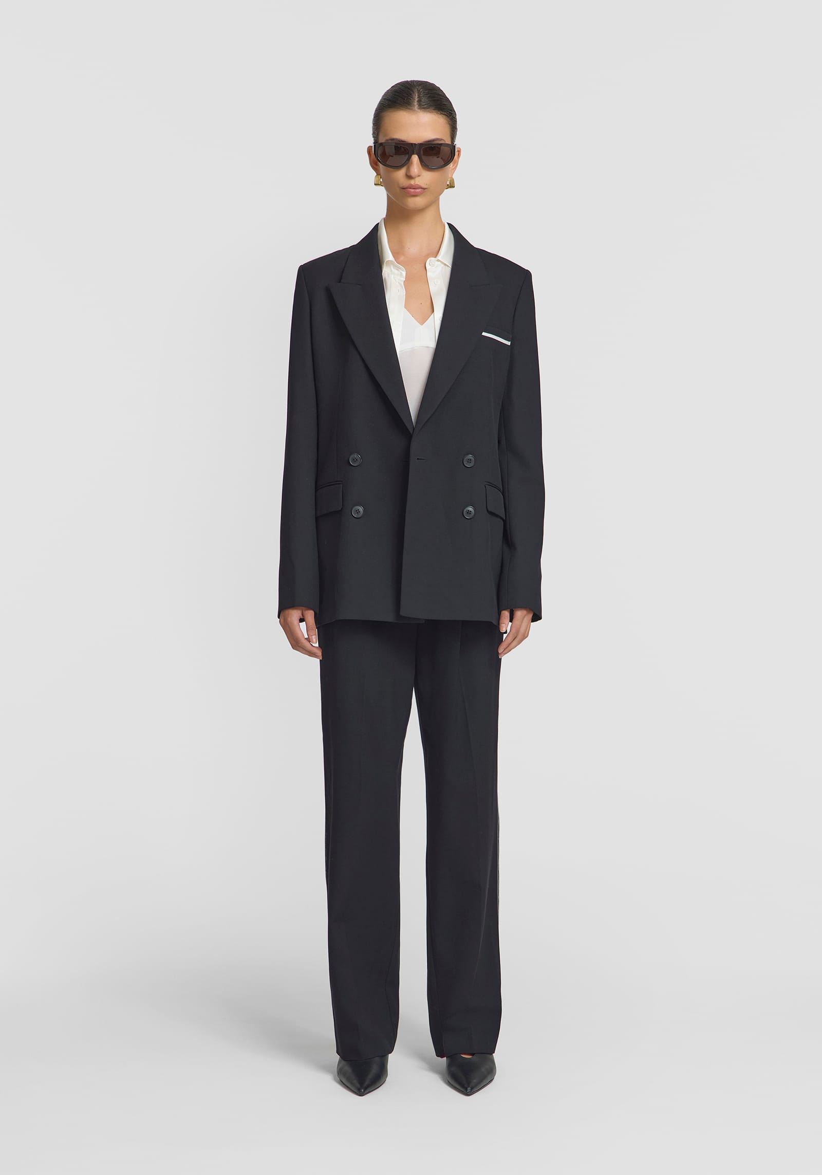 The Billboard Blazer, crafted from a luxurious black wool fabrication, fuses traditional tailoring with sport-driven details. Double-breasted with a peaked lapel and strong shoulders, it features sleek ivory piping that nods to athletic aesthetics. Complete the look with the Panther Trouser for a modern take on the classic black suit.