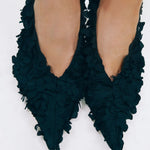 CAMILLA AND MARC Rhys black textured pointed pump. 3D cut fabric upper, nubuck leather sole. Made in Portugal.