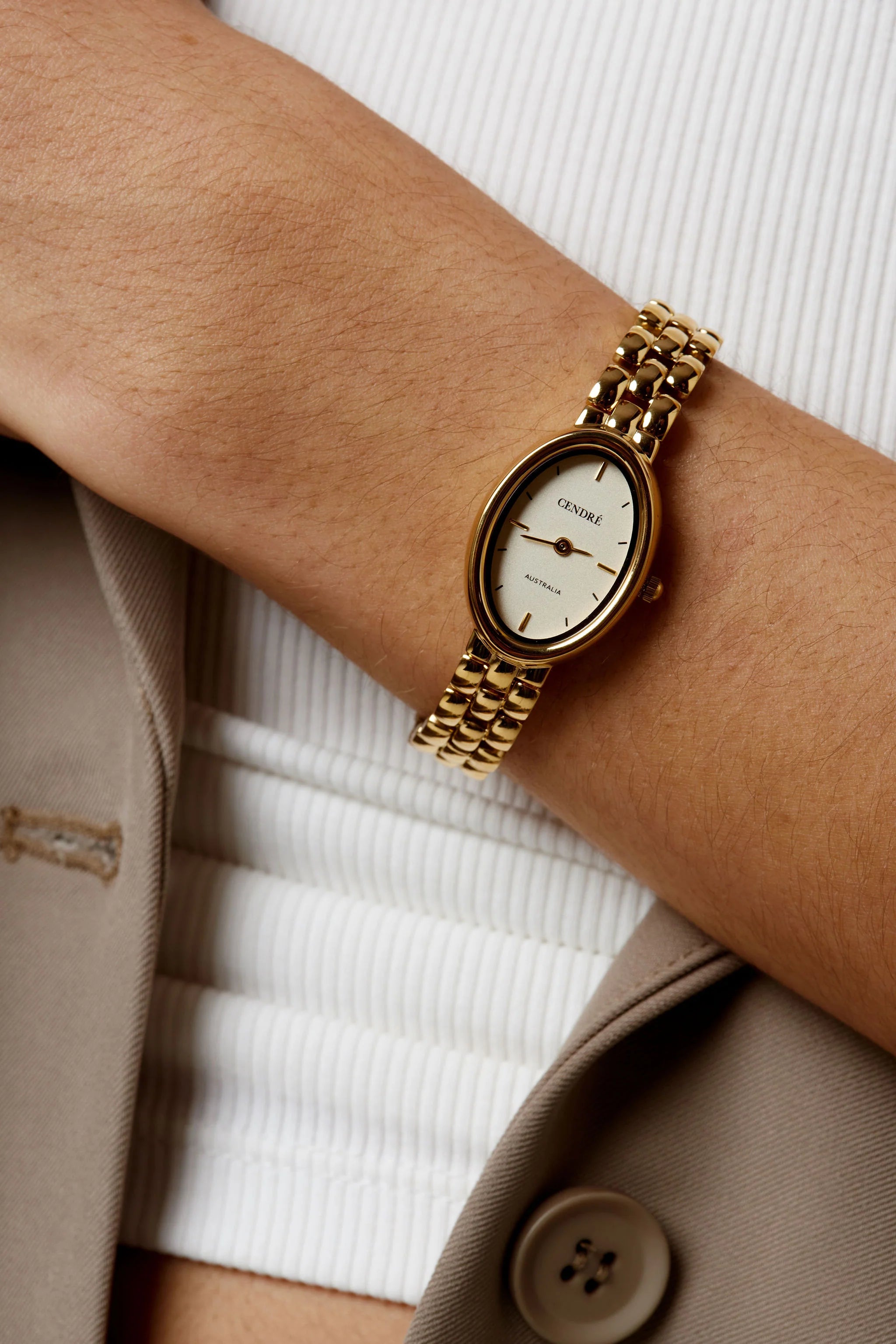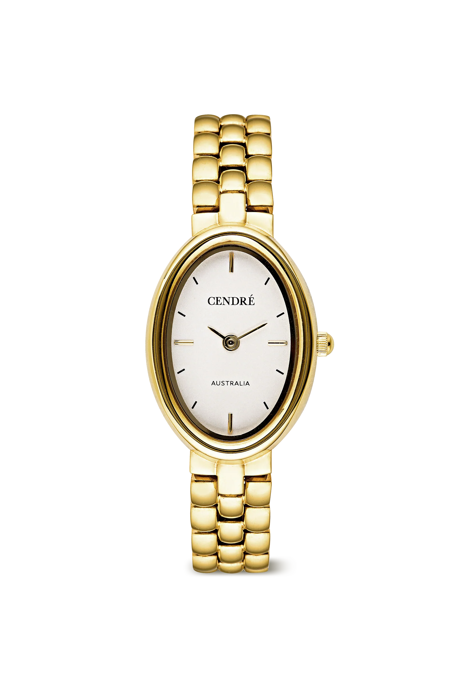 Indulge in our number one best selling Phoebe watch - a staple poised with a feminine silhouette, modern charm & practicality for the everyday. Ready to fit graciously into your adornment rotation, the Phoebe - Gold has been built on 14k Premium double gold plated stainless steel and features a white, oval faced imprinted with our signature brand-mark and adjustable strap to personalise your fit.
