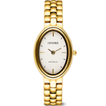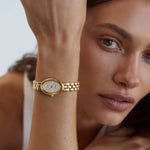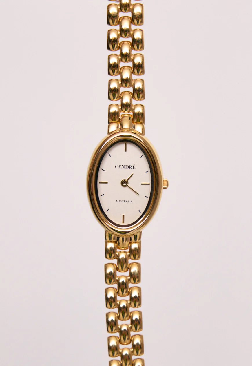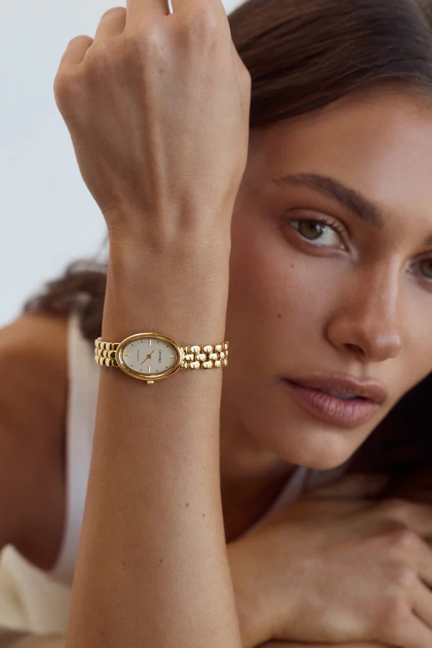 Indulge in our number one best selling Phoebe watch - a staple poised with a feminine silhouette, modern charm & practicality for the everyday. Ready to fit graciously into your adornment rotation, the Phoebe - Gold has been built on 14k Premium double gold plated stainless steel and features a white, oval faced imprinted with our signature brand-mark and adjustable strap to personalise your fit.