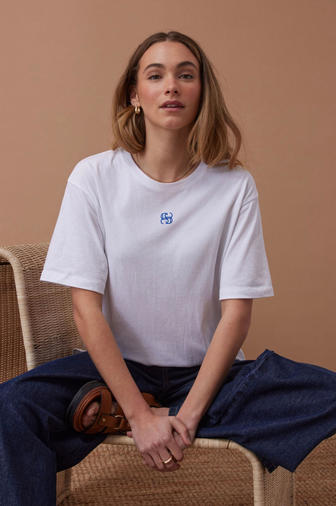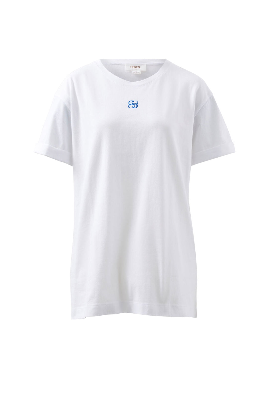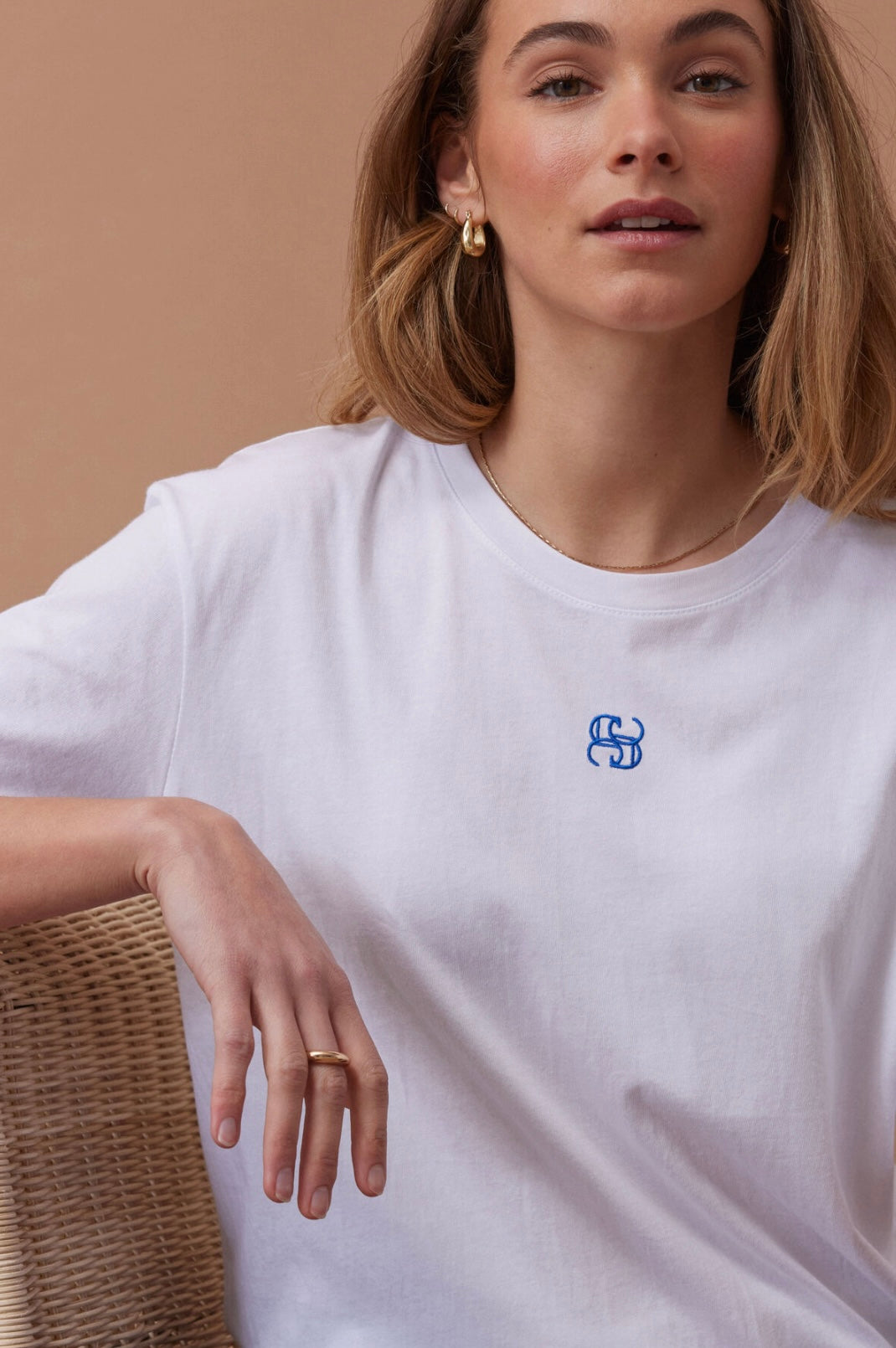 Ceres Life Lola Longline Step Hem Tee | White/Azure Blue Monogram