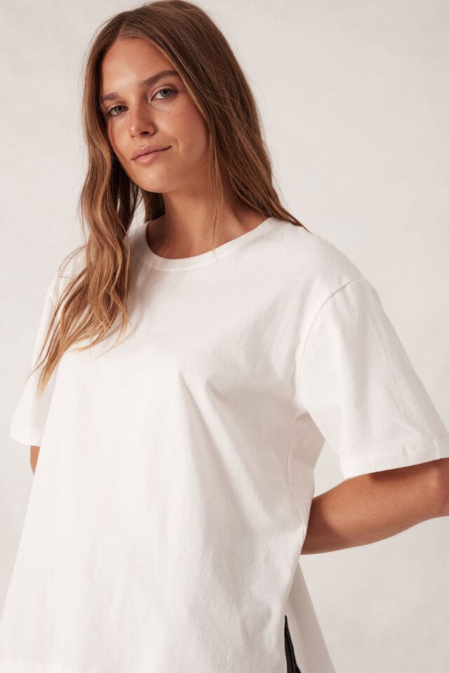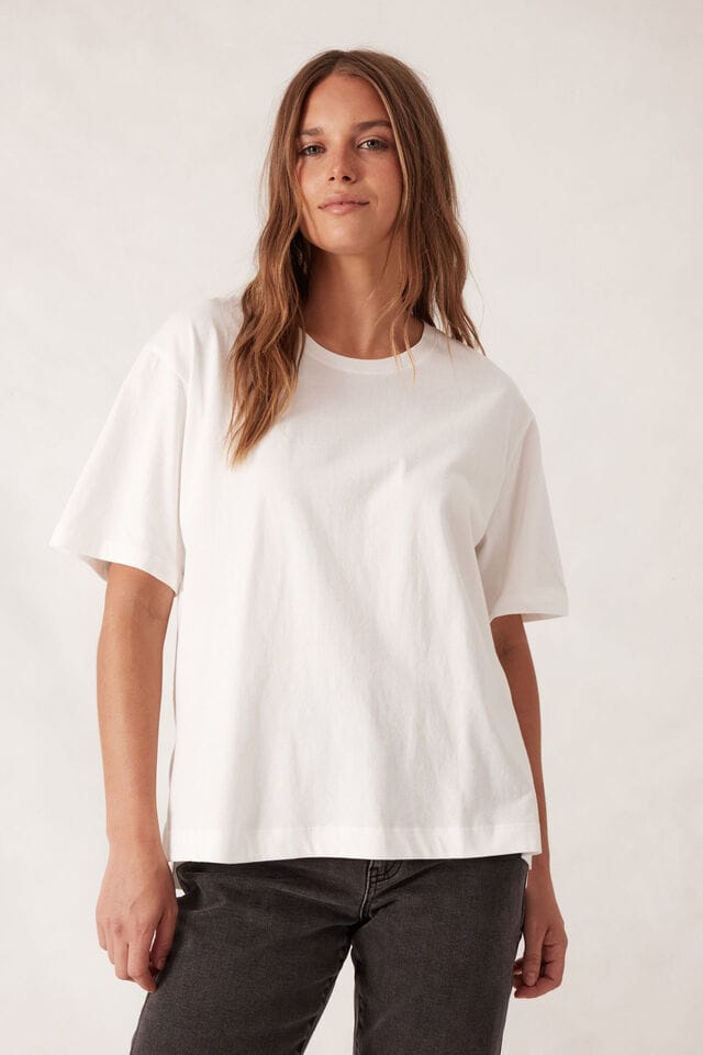A Ceres Life signature style, our slouchy split hem tee is an everyday staple. A relaxed shape featuring a slightly dropped shoulder, square shaped sleeve and finished with a stepped hem and side split. This is our OG classic style, now renewed in our proudly sourced in Australian Cotton soft jersey.