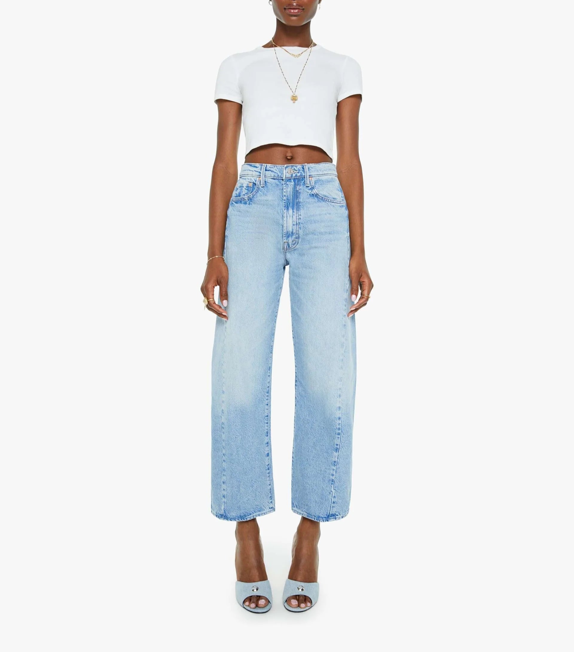 High hopes. A super high-waisted jean with a wide, curved leg, an ankle-length inseam and a clean hem. Made from SUPERIOR denim, Did You Bring Me Anything? is a dark blue wash with whiskering and fading at the knees.