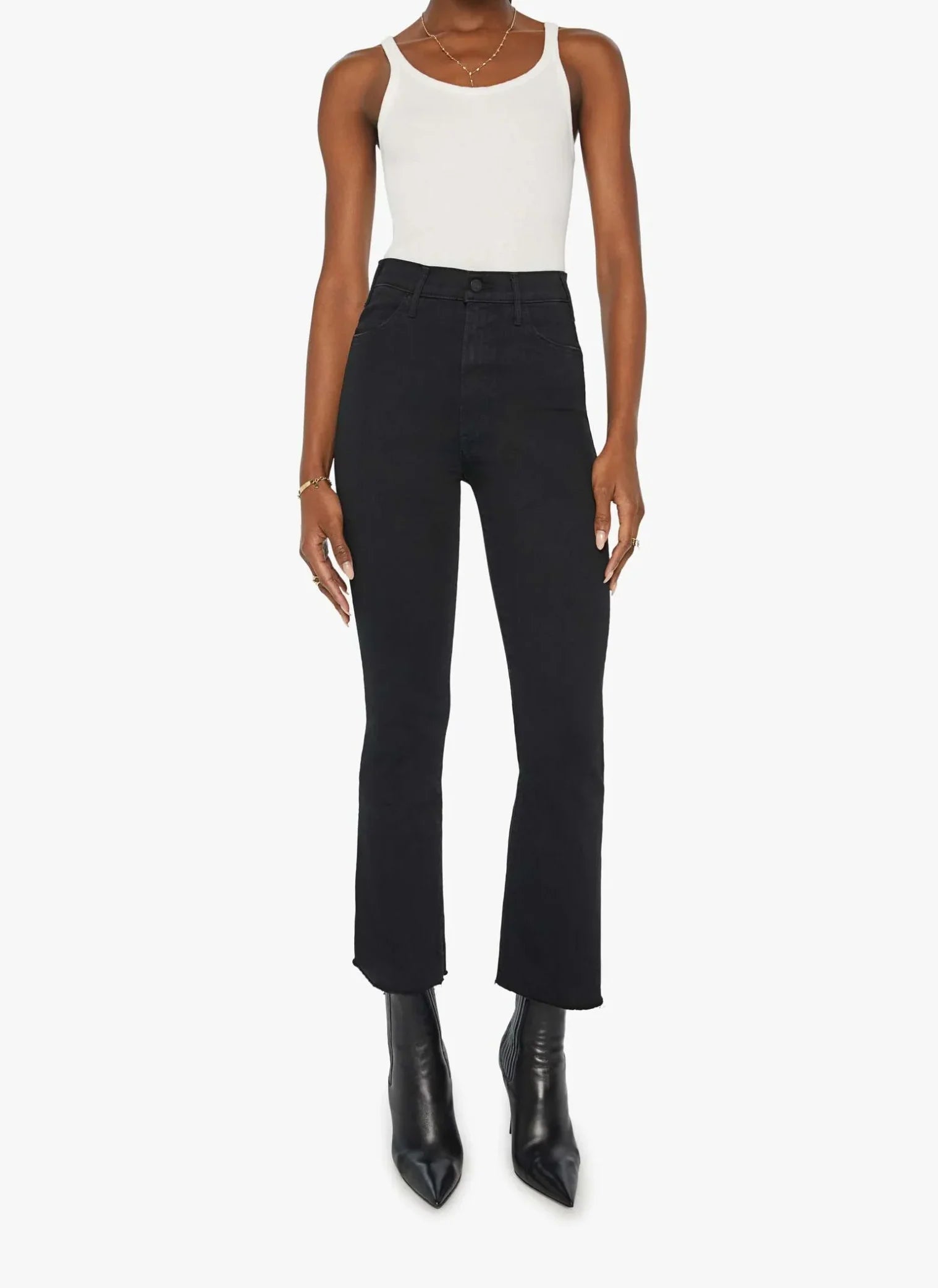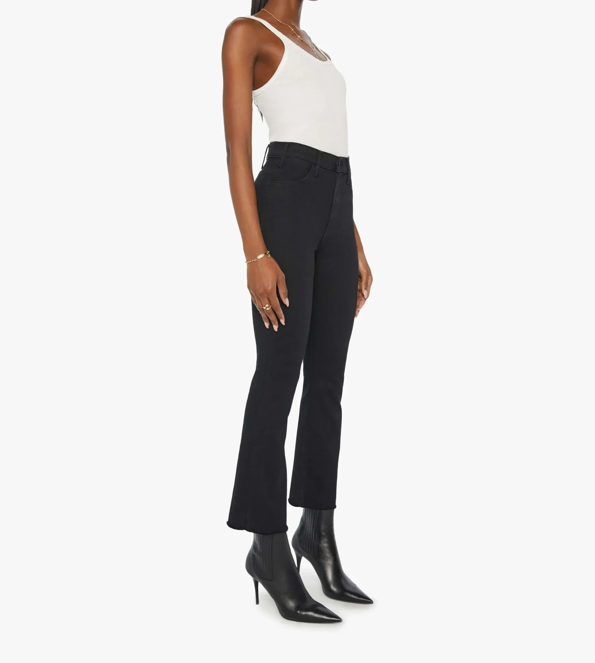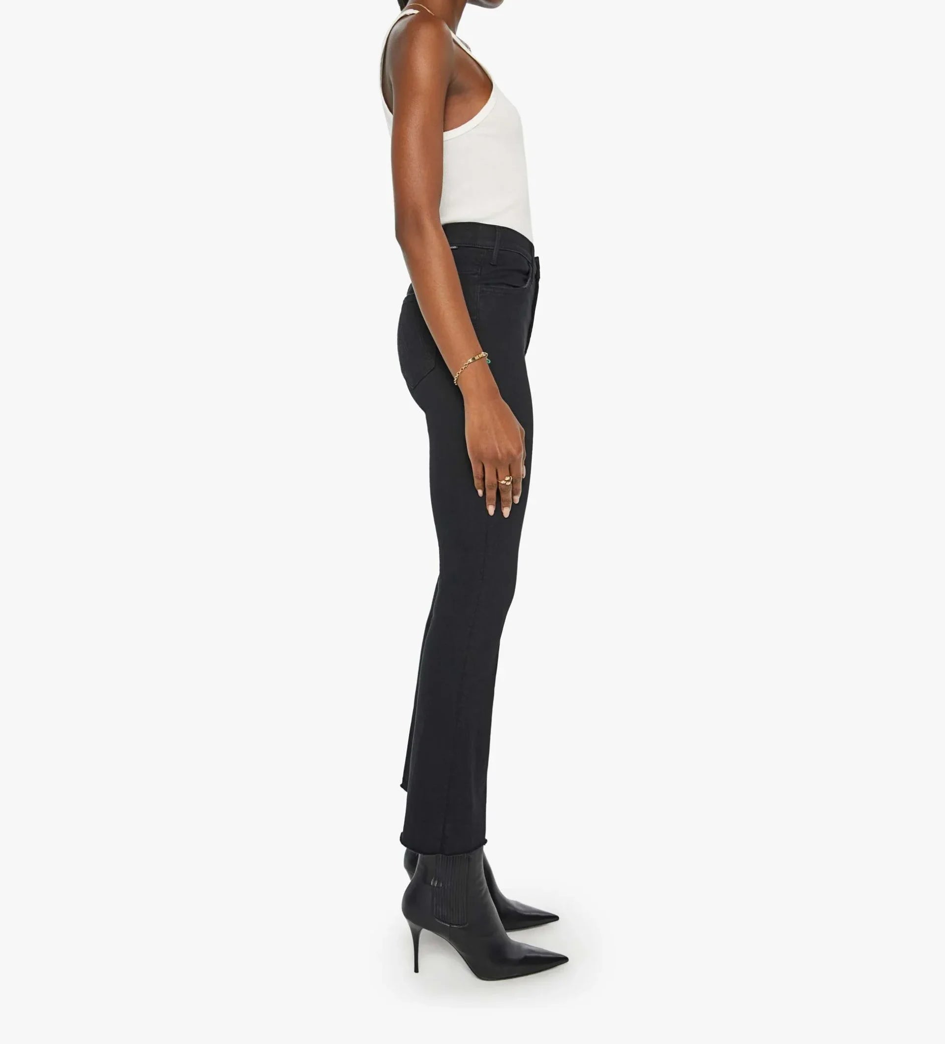 Plead the fifth. These bestselling high-waist flare jeans have an ankle-length inseam and a raw hem. Made from stretch denim, Not Guilty is our bestselling black wash.