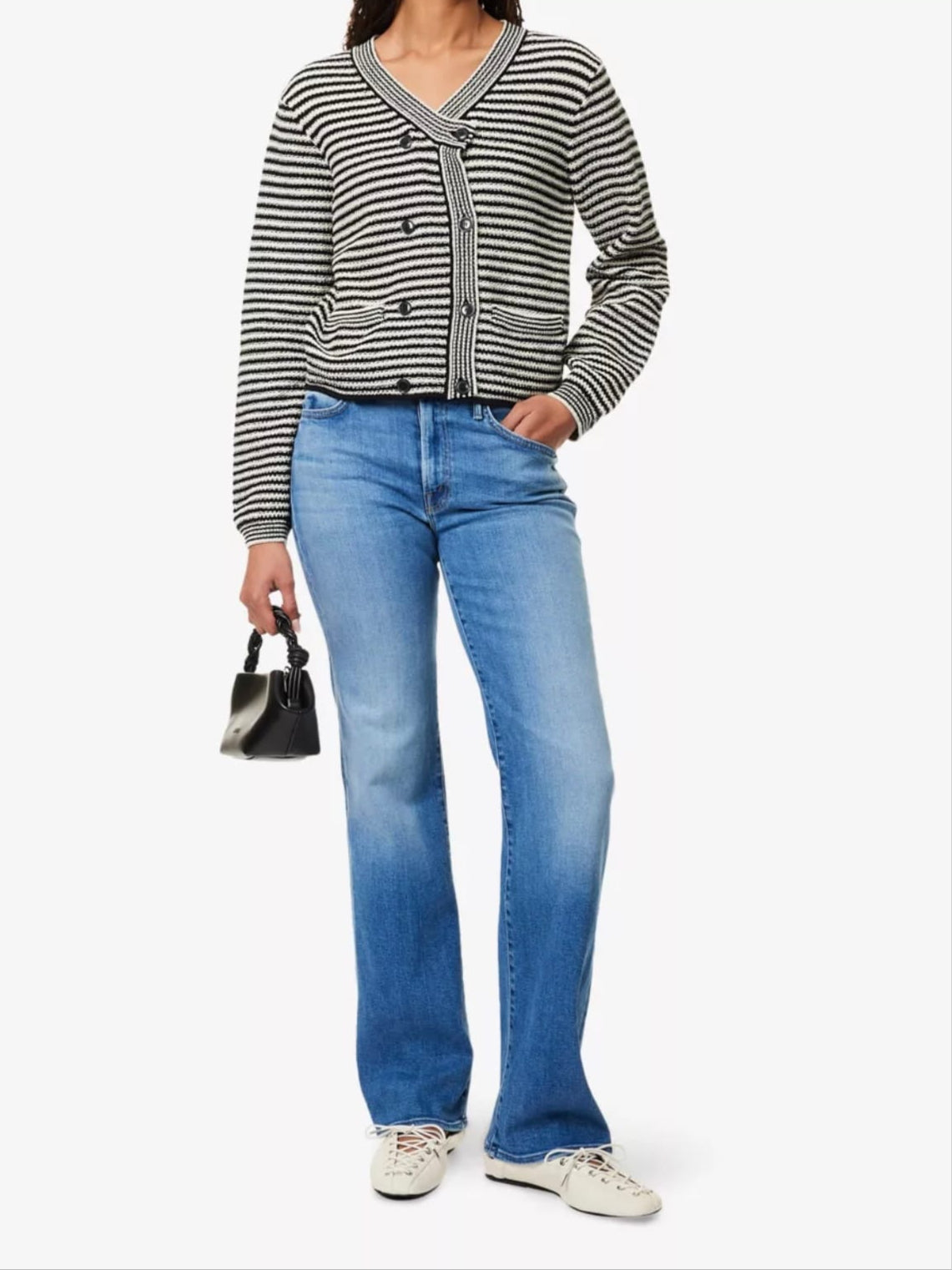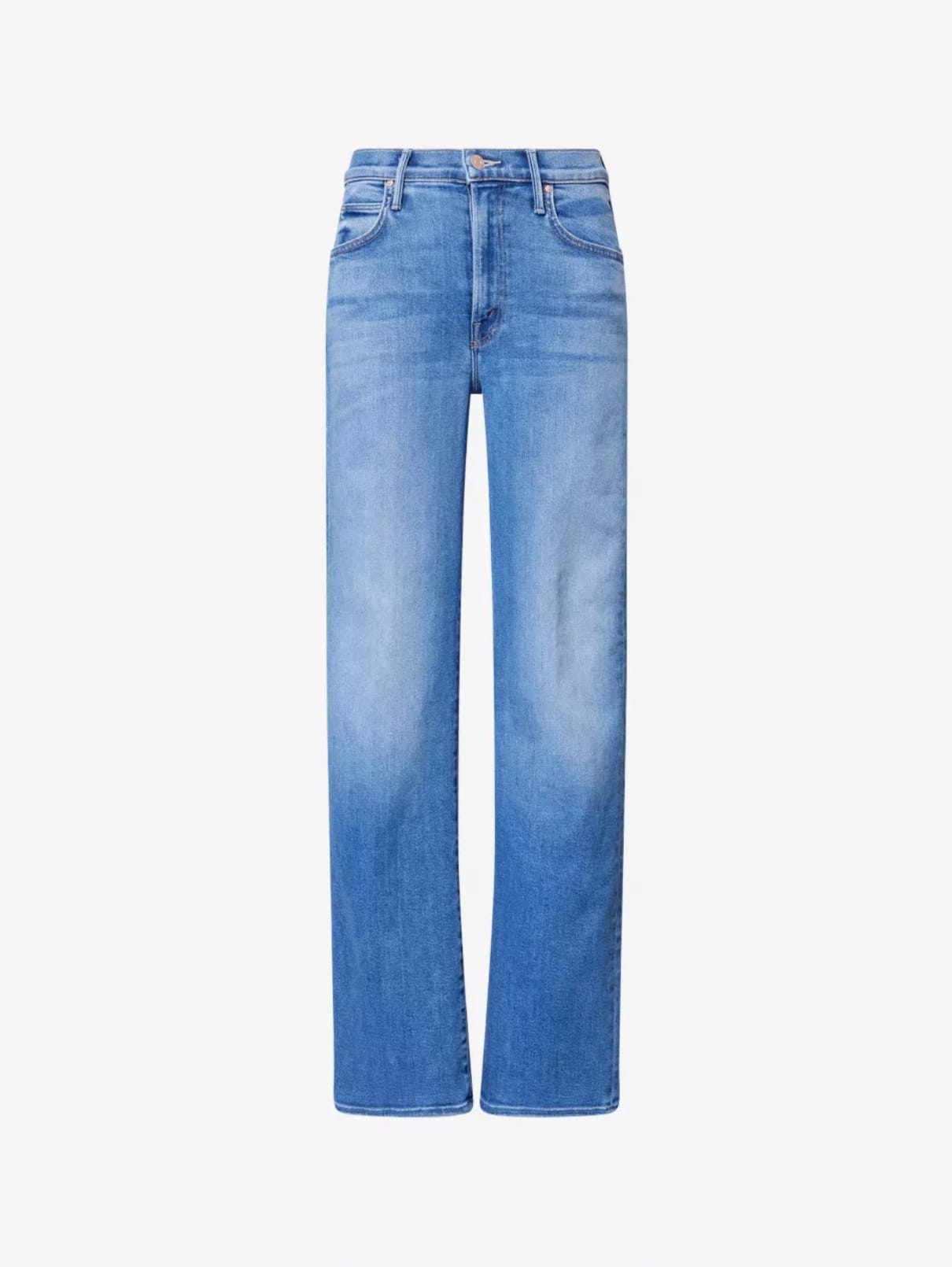 - Straight leg, high-rise, belt loops, five pockets, all-over faded wash