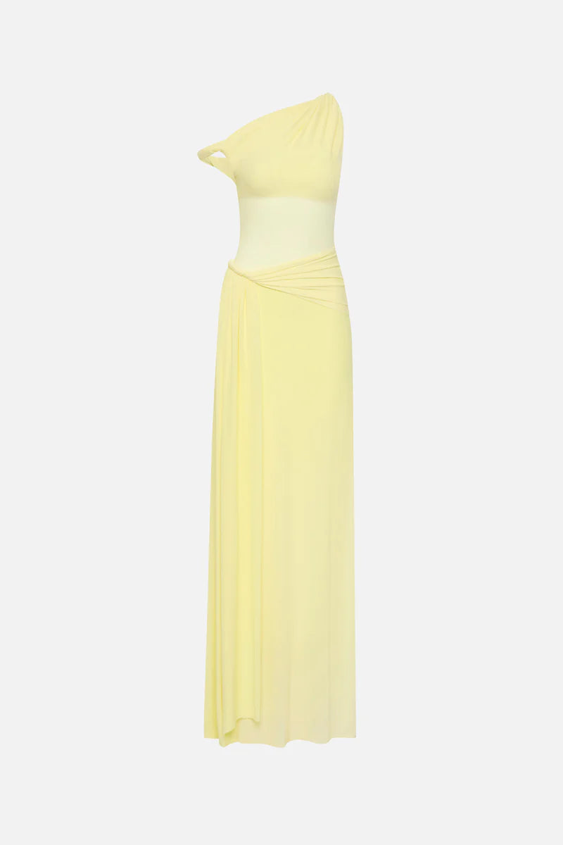 The Sisal Mesh Maxi Dress in Lemon an effortless, yet sexy draped silhouette that skims the body.