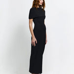 The Calia Dress alludes modern sophistication with effortless refinement. Featuring a sleek boat neckline that cascades into a seamless cape detailing that falls over the bust. Calia features a body contouring silhouette with a daring open back that adds a touch of sensuality and allure. Calia is made for all seasons and occasions, designed to evolve with you through all seasons.