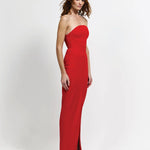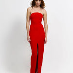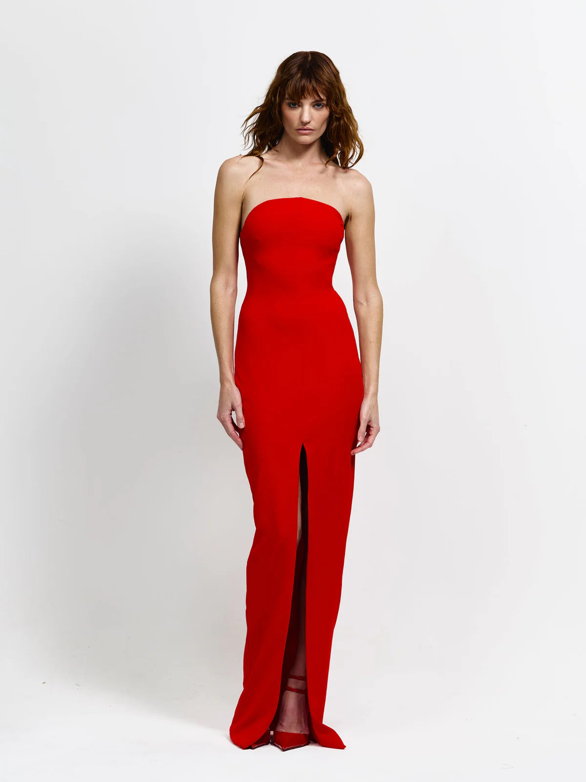 Introducing the Lani gown, a striking blend of statement dressing and feminine allure. Lani features a beautiful curved neckline that seamlessly cascades into a floor length gown. Perfectly cinched at the waist, Lani stands out with a daring front split for a touch of added sensuality and confident dressing. Crafted for the woman who demands attention through timeless luxury.
