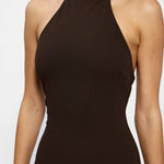 ntroducing the Rhi Gown, a timeless silhouette to take you through all seasons. Detailed with an open back and a high neckline, flowing beautifully into a floor length gown. Crafted with our stretch crepe fabrication for a soft and luxe feel on the body. The Rhi Gown is the perfect ensemble to take you through special occasions and understated evenings and events.