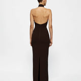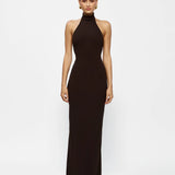 ntroducing the Rhi Gown, a timeless silhouette to take you through all seasons. Detailed with an open back and a high neckline, flowing beautifully into a floor length gown. Crafted with our stretch crepe fabrication for a soft and luxe feel on the body. The Rhi Gown is the perfect ensemble to take you through special occasions and understated evenings and events.
