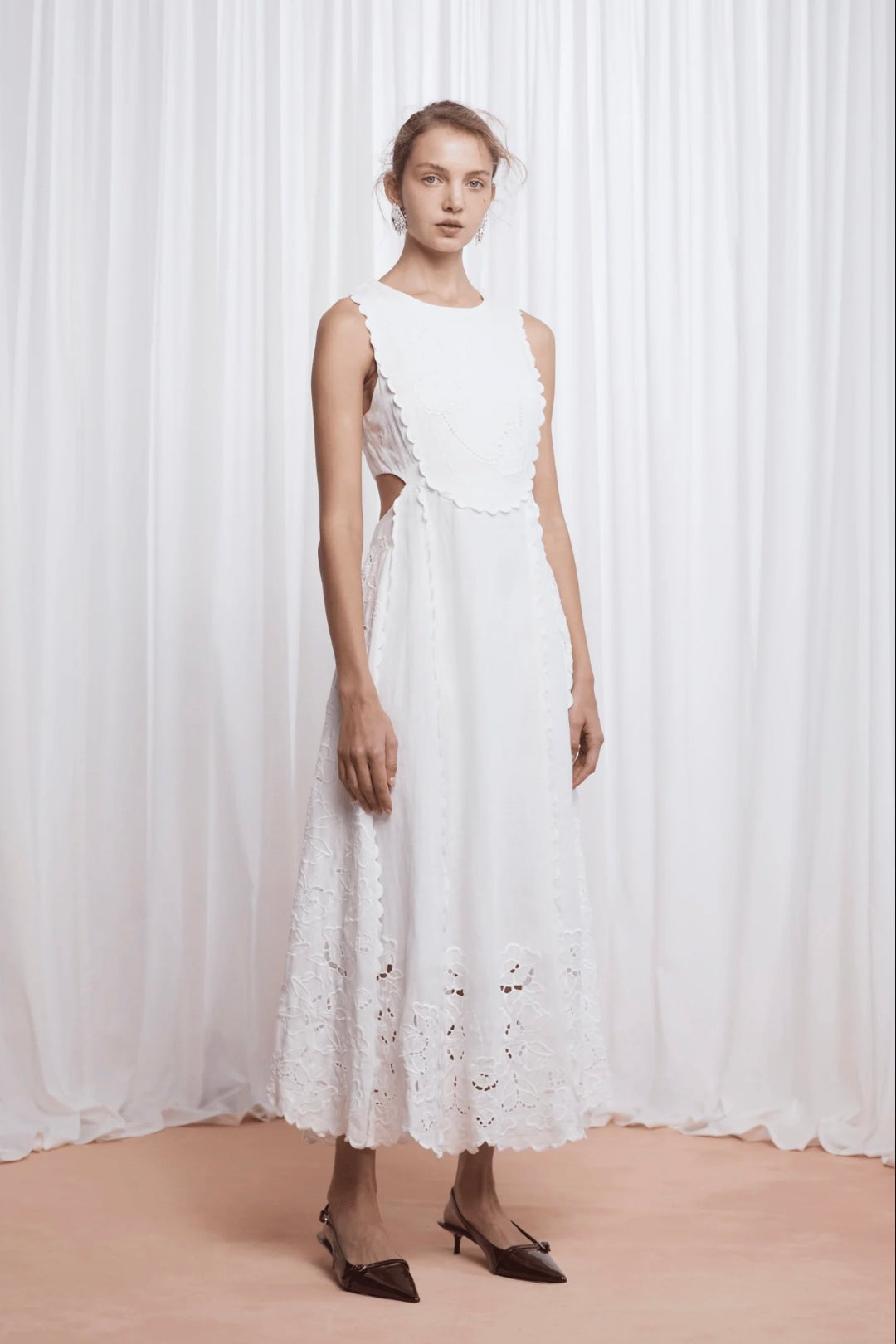 The Amelia dress in white is made from premium 100% linen, featuring a delicate cutwork embroidery bodice panel, cut-out side details and a sweeping full embroidered skirt.