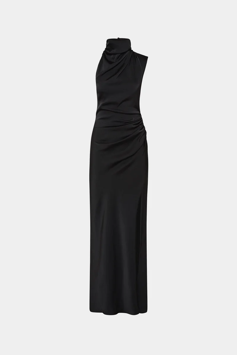 Classic design. Column silhouette with sash detailing that drapes around the neck. Creating a refined asymmetric neckline.