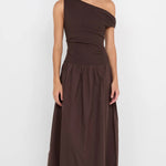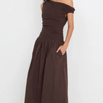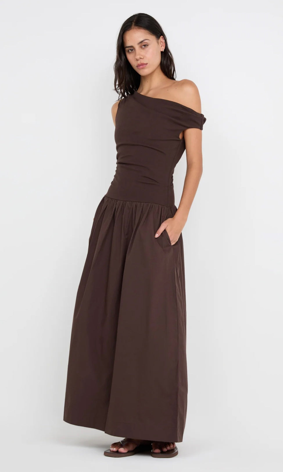 Freya Asym Maxi Dress in Dark Chocolate. This versatile Dark Chocolate maxi dress combines comfort and style, featuring an asymmetrical neckline and practical pockets for easy, elevated dressing.