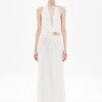 An all-over sequin dress with assymetric plunge neckline. Accented by metal ring hardware at the midriff creating delicate gathers. The garment boasts an exposed open-back finished with a refined metal ring closure.