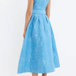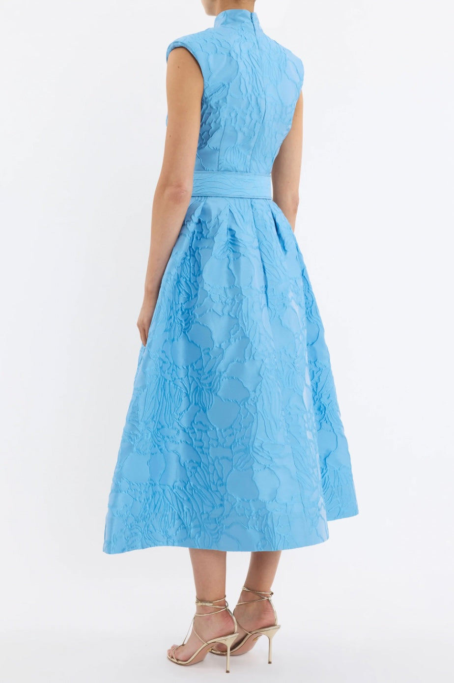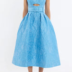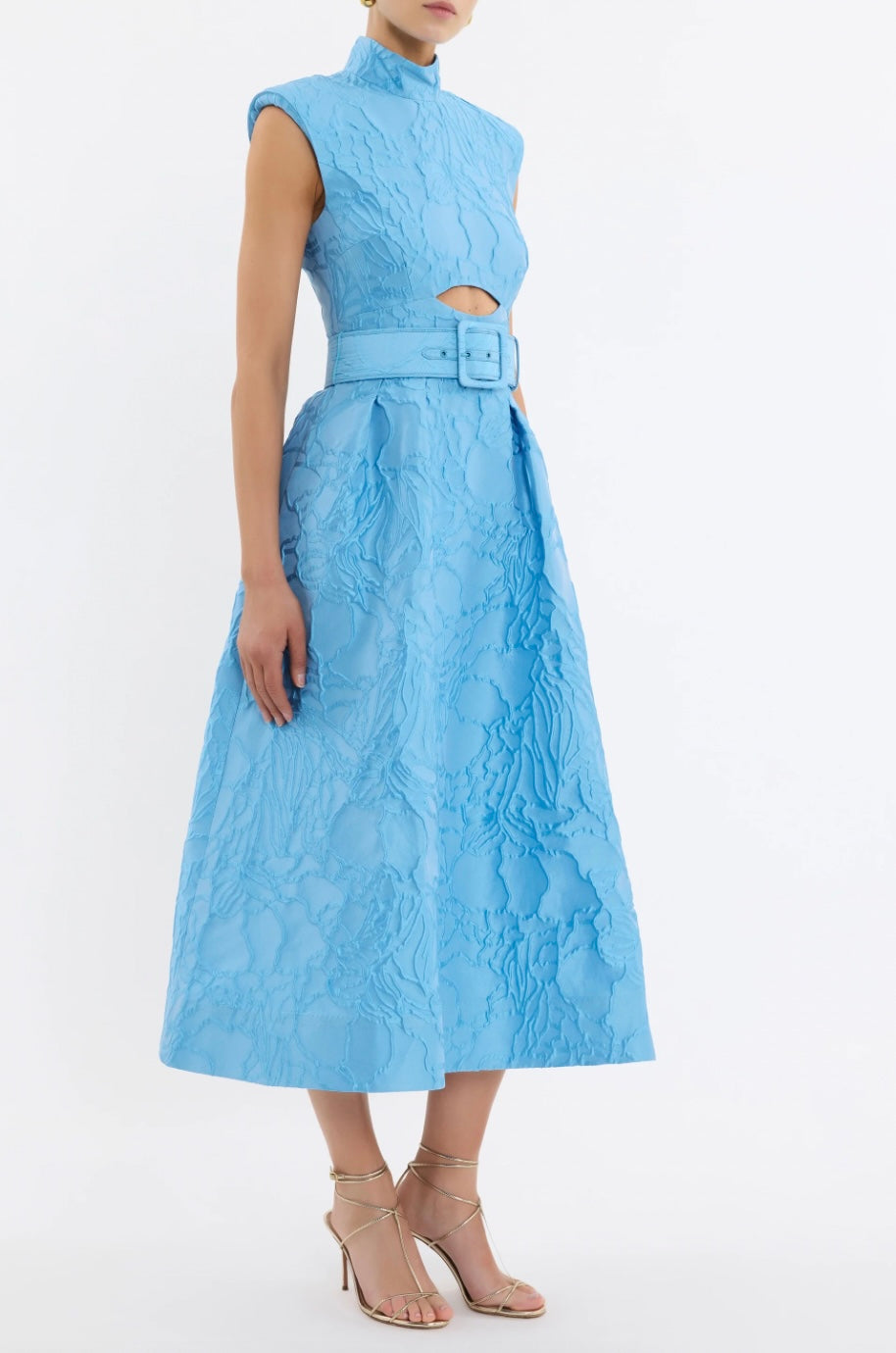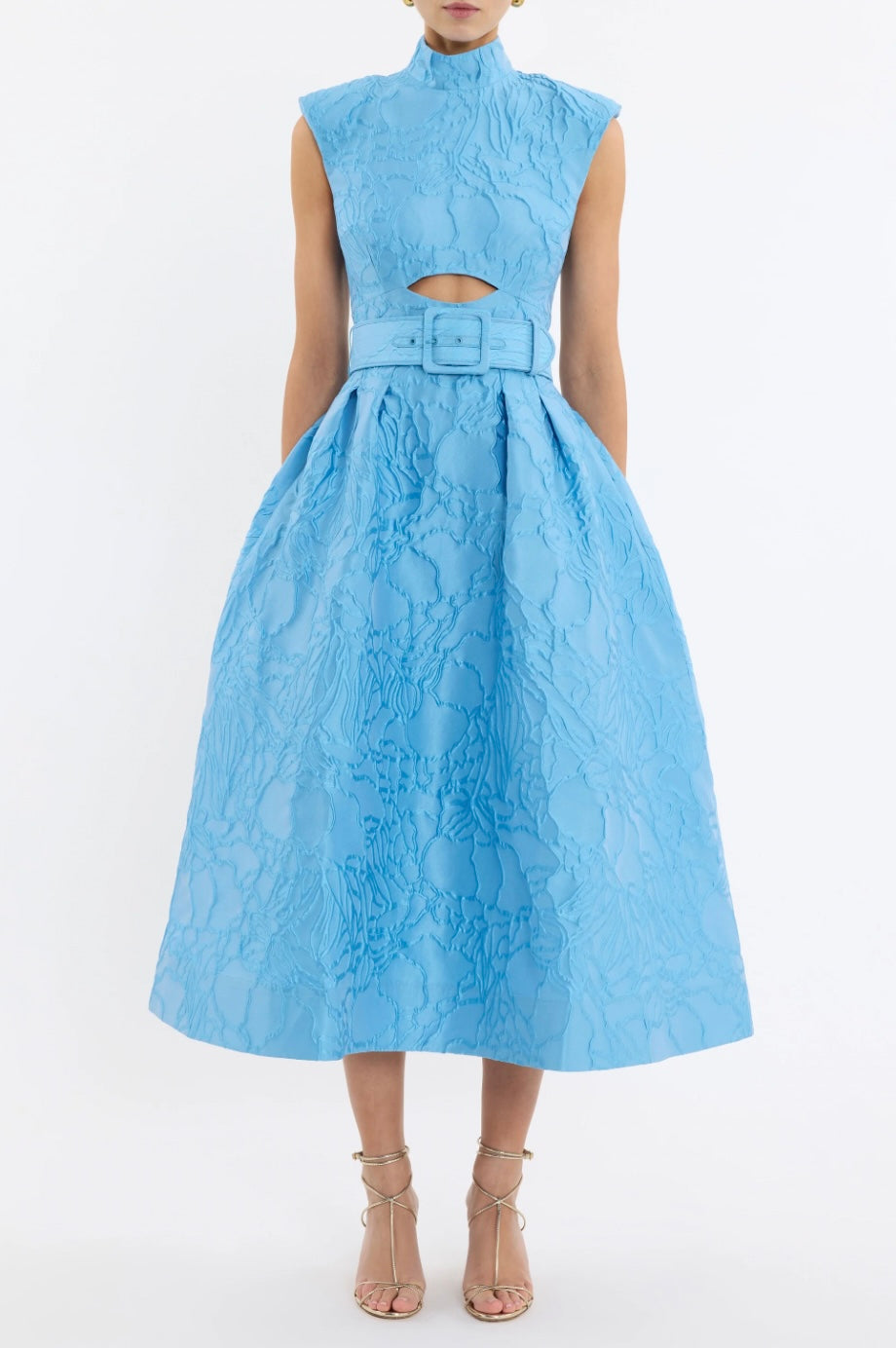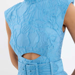 The Aegir Midi Dress in blue epitomises modern elegance, tailored from embossed jacquard. Its high neckline and sleeveless fitted bodice are adorned with a front cut-out, cinched at the waist with a self-belt to flatter the figure. Its circular midi skirt shapes an elegant silhouette, secured with a zip fastening at the back for a precise fit. Complete with lining, this dress is a lovely choice for your next special occasion.