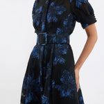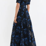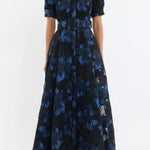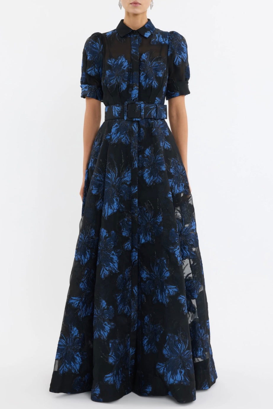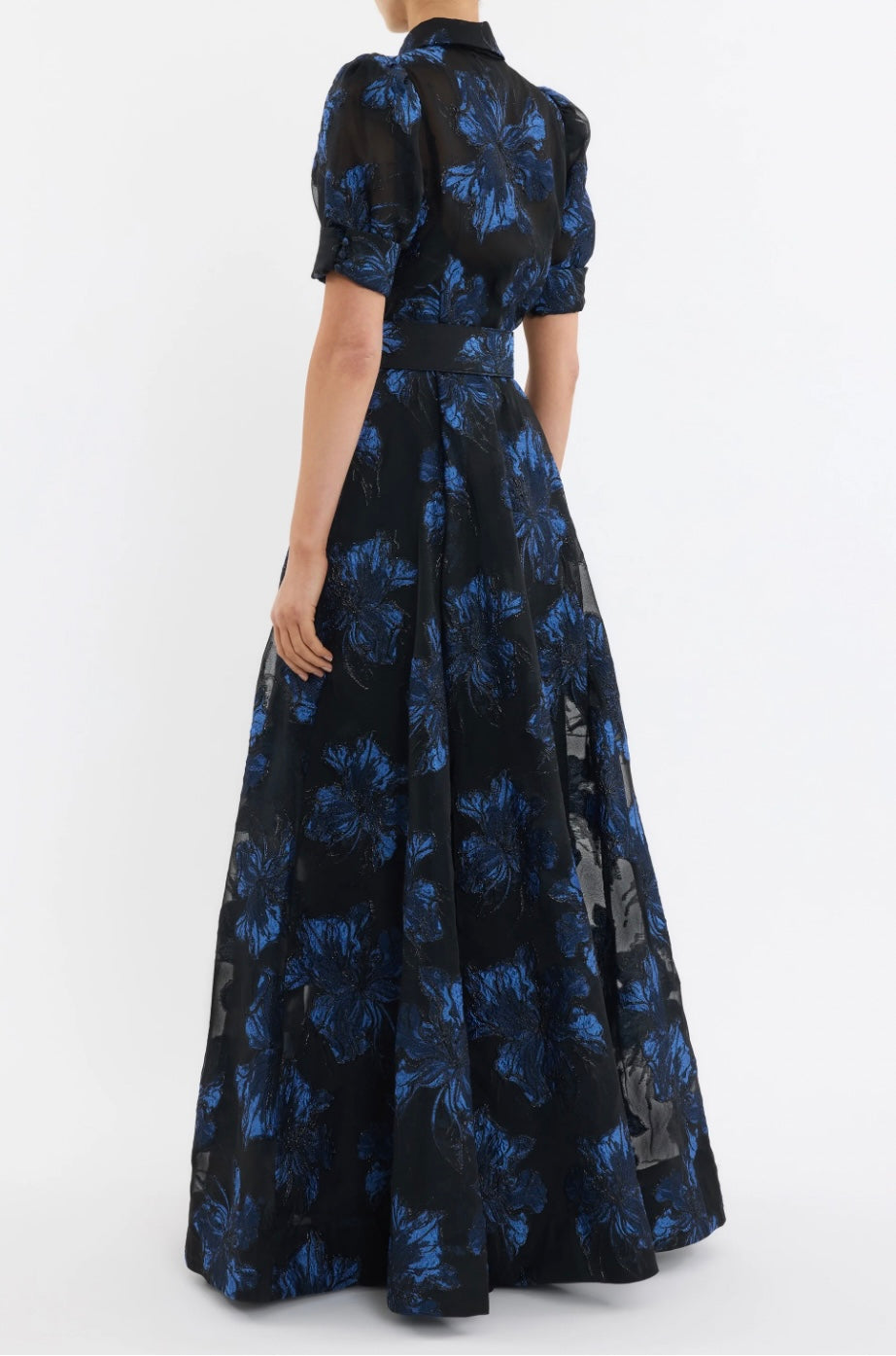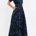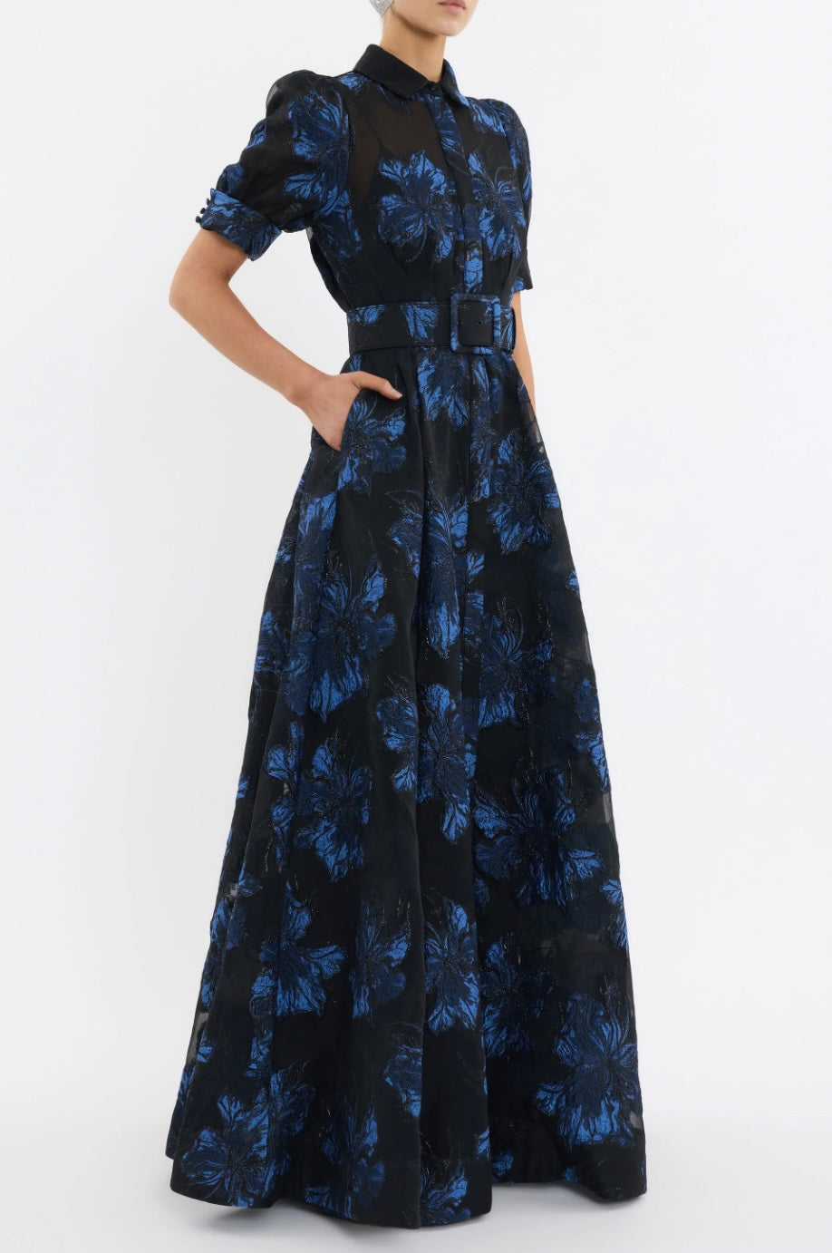 The Alexandra Gown blends modern sophistication with timeless style, crafted from metallic brocade in striking hues of blue and black. Featuring a collared neckline and short puff sleeves with cuffed detailing, its relaxed silhouette is refined with a concealed placket and side seam pockets. A self-belt cinches the waist to flatter the figure, while the circular maxi skirt flows gracefully for ease of movement. Perfect for your next event, this gown includes a slip dress with adjustable straps for versatile styling.