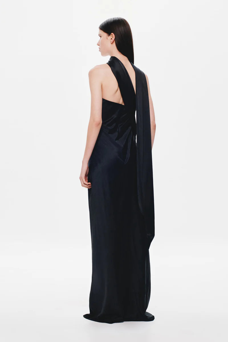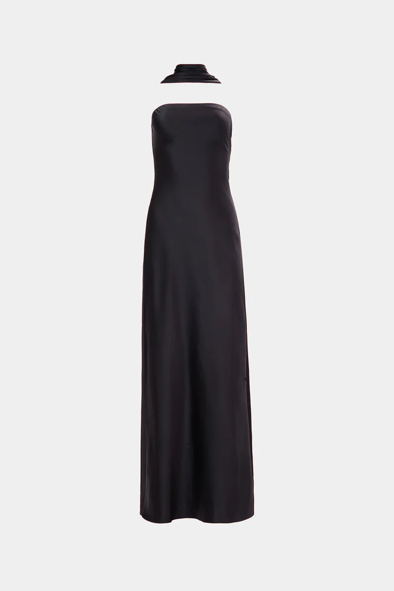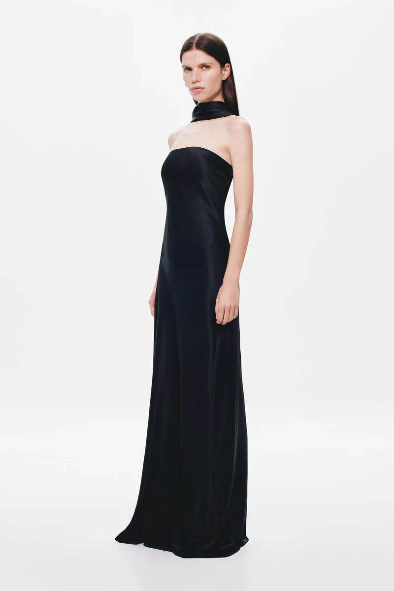 Embrace timeless elegance in our strapless satin bias cut gown with a long sash designed to drape around the neck, it's a statement of sophistication.