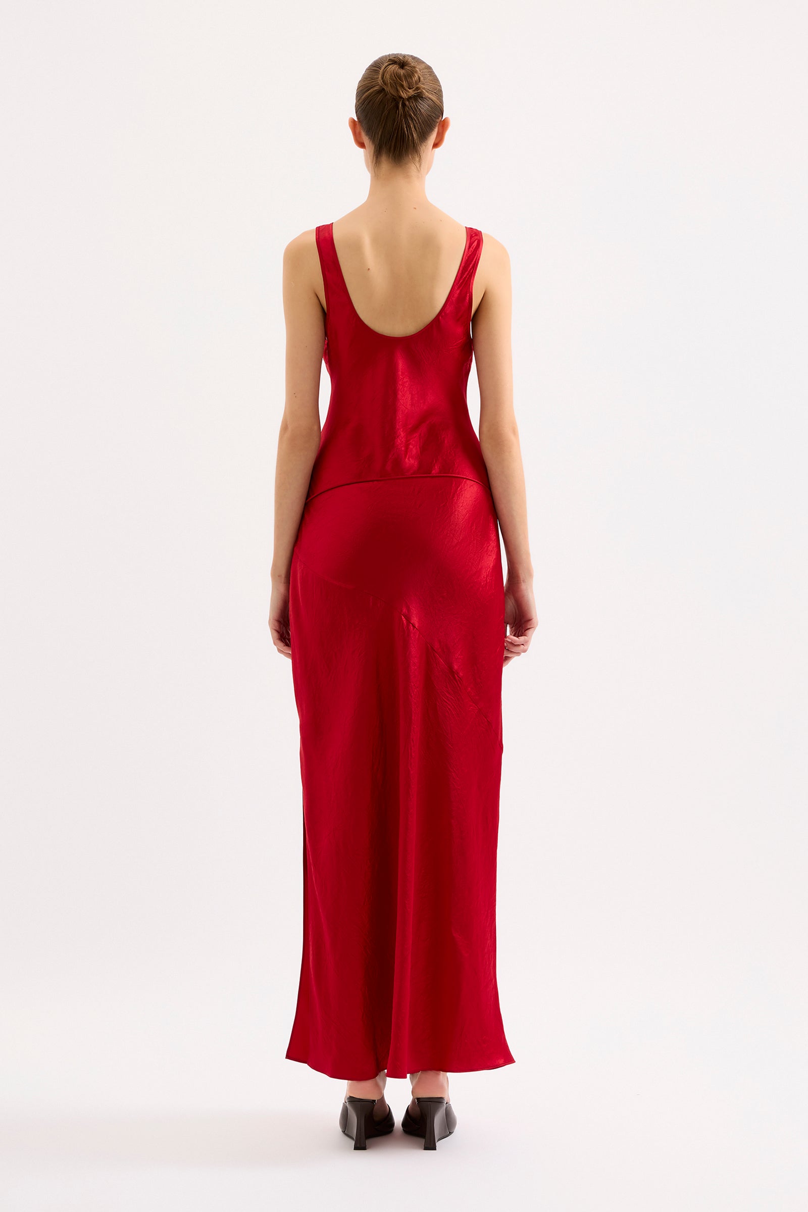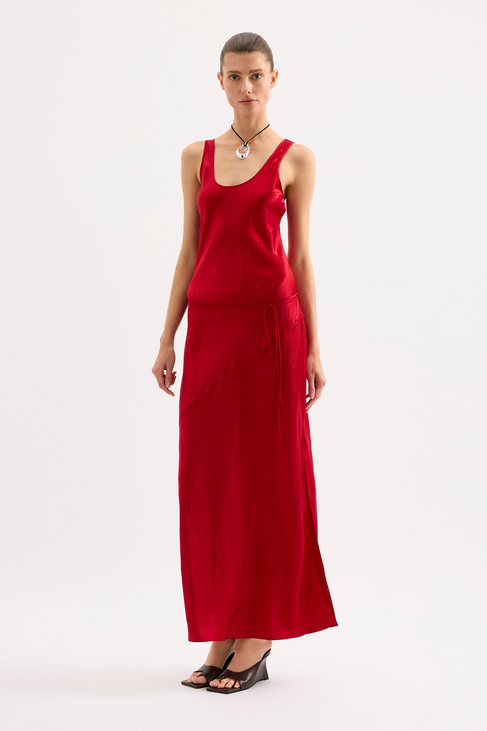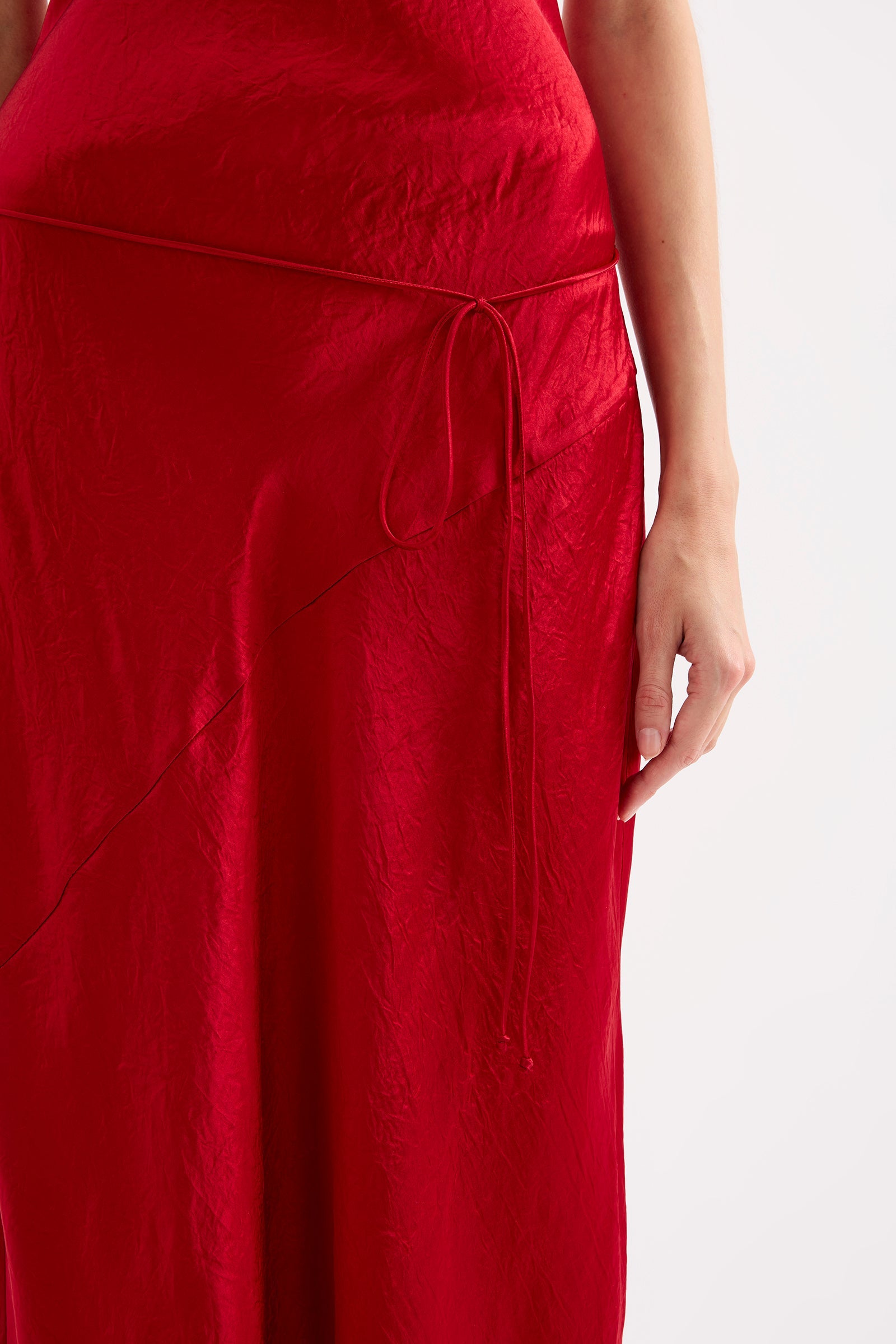 The Allegra Slip Dress is made from a premium satin featuring a luminous, gloss finish and subtle crinkle texture. Cut on the bias, this silhouette drapes over the body softly and finishes above the ankles. Features include a low scoop neckline, waist tie and side slit.