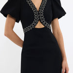 The Nyx Puff Sleeve Midi Dress epitomises timeless elegance infused with modern design. Featuring diamante embellished trim, the fitted bodice with a front cut out and rounded neckline harmonises beautifully with voluminous short puff sleeves, creating a sophisticated silhouette. Cinched at the waist, the pencil midi skirt is enhanced with a back split, adding an alluring touch to the design. Fully lined and secured with a zip fastening at the back, this polished dress is a chic choice for your next special occasion.