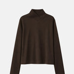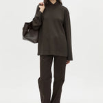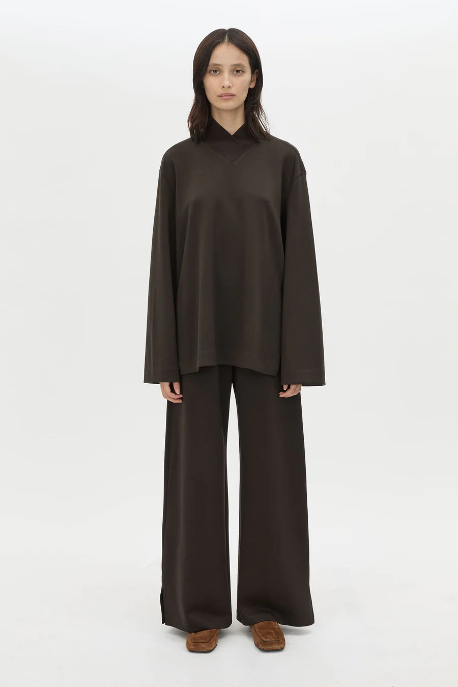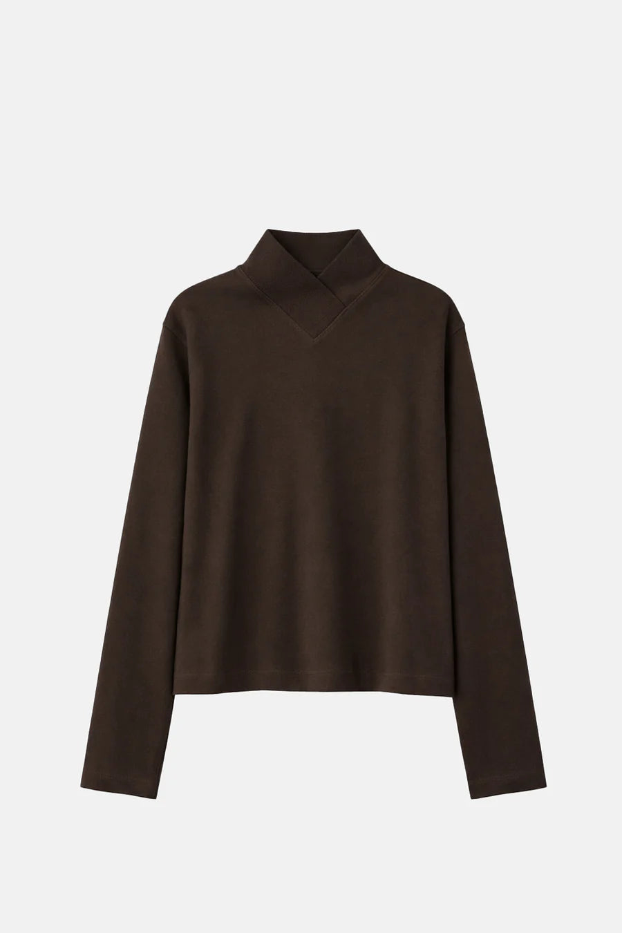 CAMILLA AND MARC Bessette long sleeve brown top with high neck. Side splits, flatlock stitch detail at seams, blind hem.