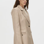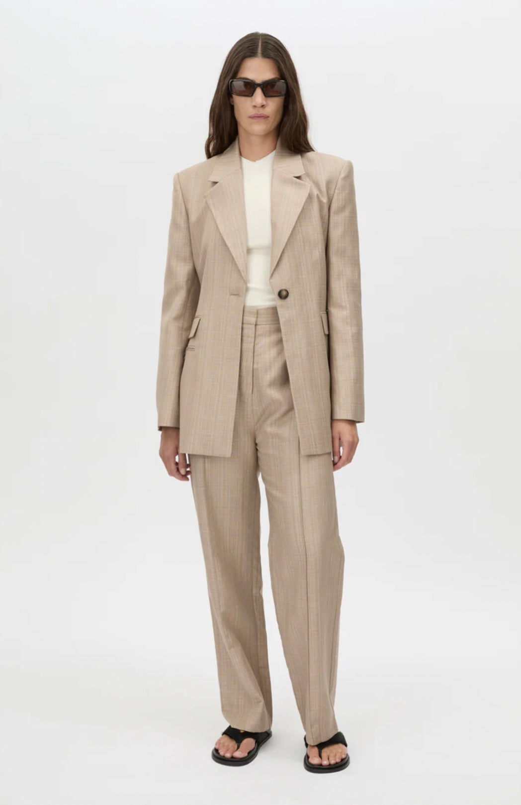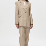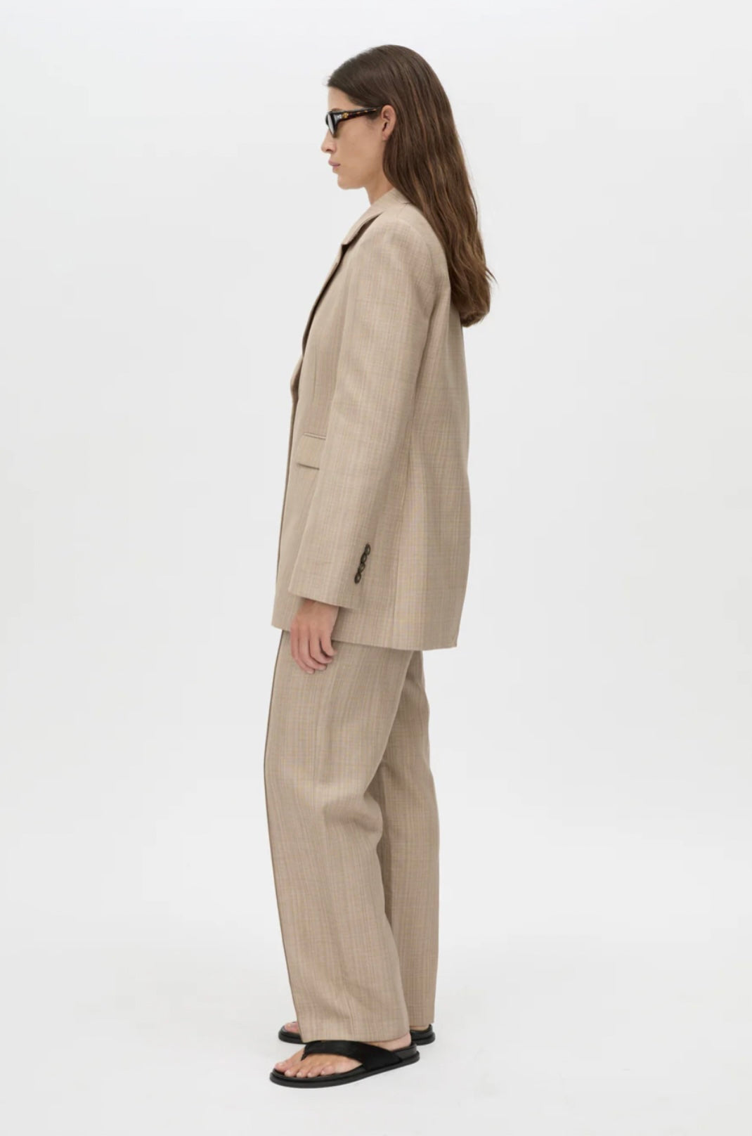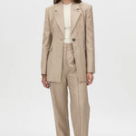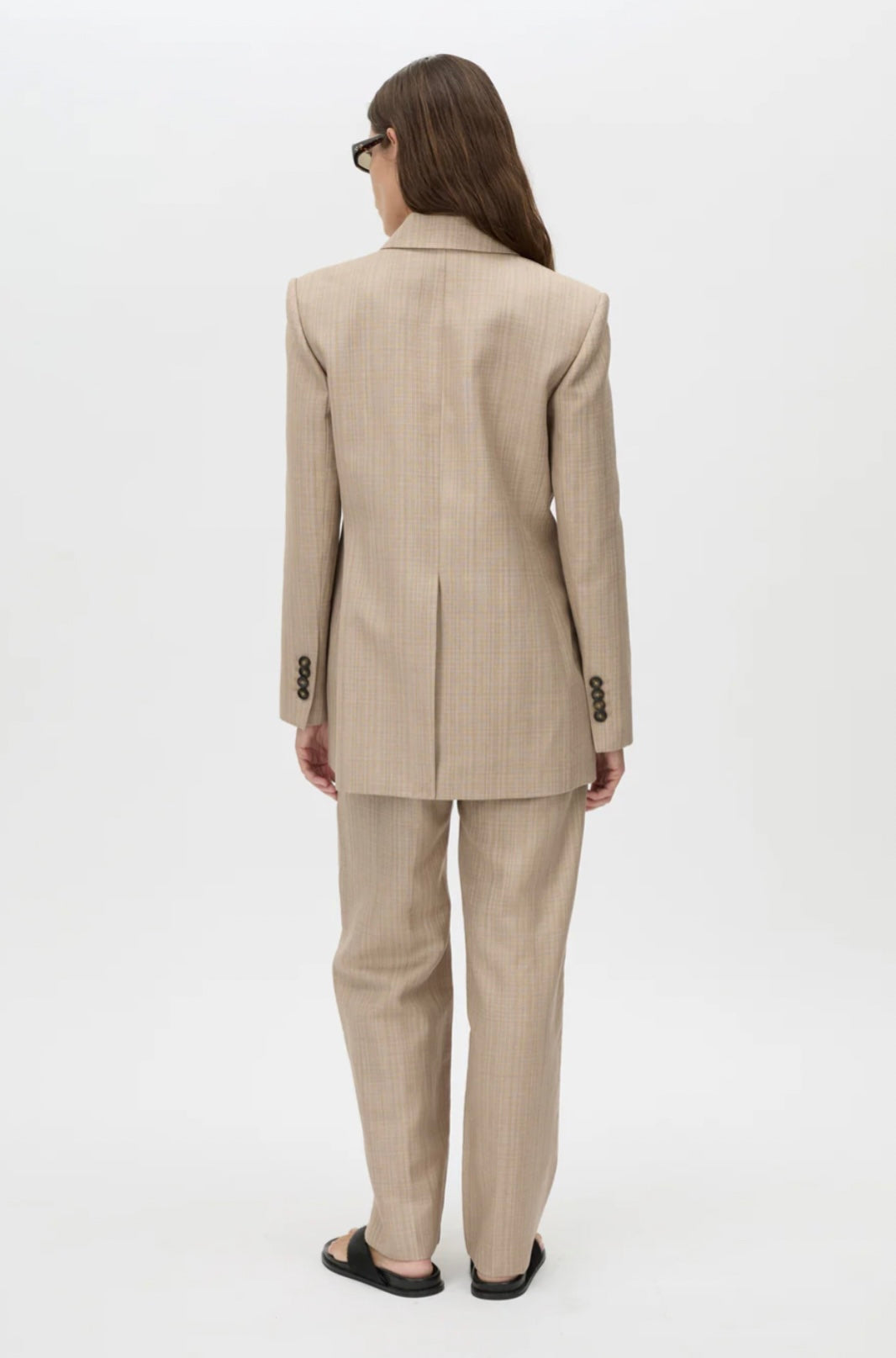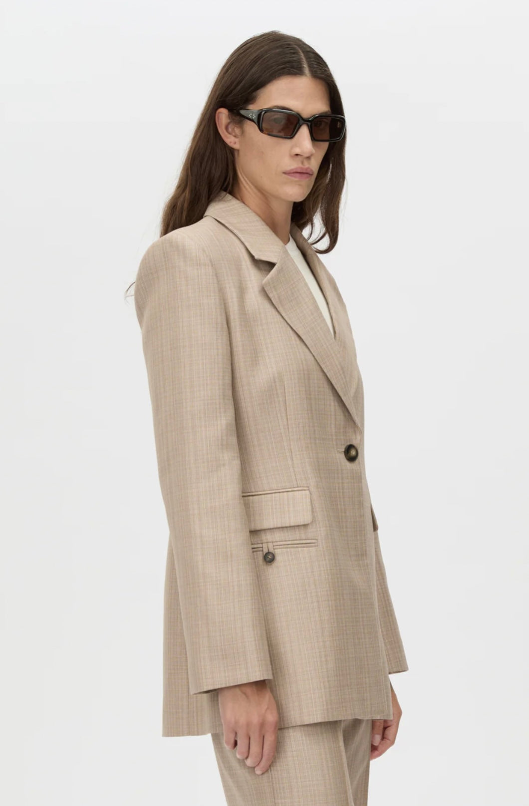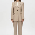 CAMILLA AND MARC Faro single-breasted caramel blazer with contrast under collar facing. Crafted from a wool-linen blend. Permanent press on sleeve. Single breast jet pocket, welt pockets on hip. Back vent opening.