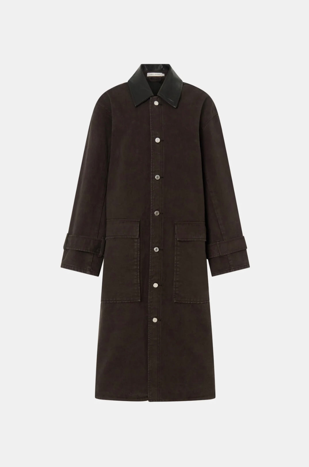 CAMILLA AND MARC Enzo oversized brown denim coat with contrast leather collar. Button sleeve tabs, patch pockets. Centre front branded shank button placket.