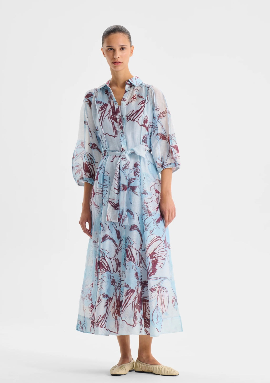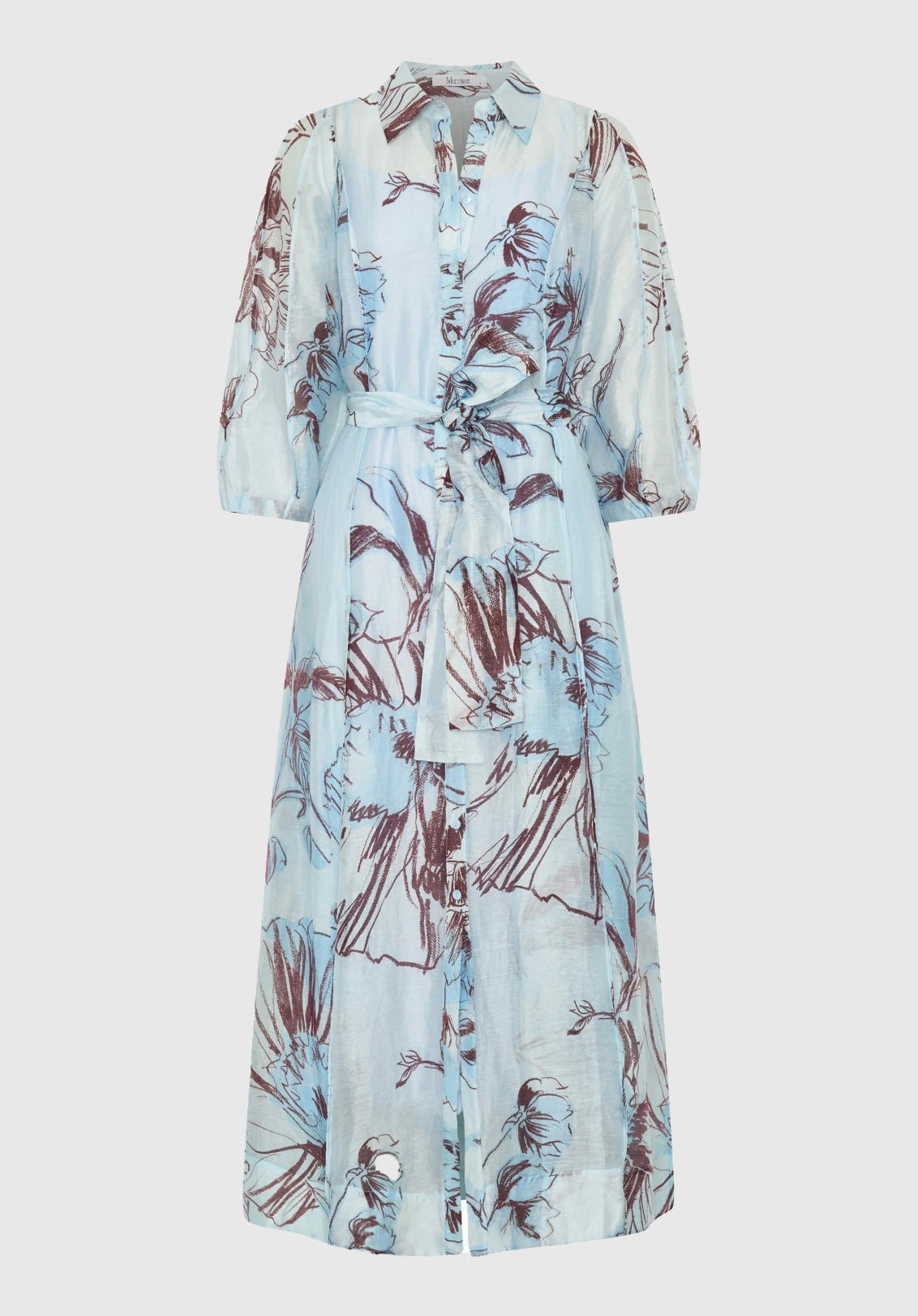 Crafted from a textured semi-sheer linen blend in Morrison’s exclusive print, the Mae Shirt Dress features a traditional collar, button front placket, and 3/4 panelled sleeves. Designed with pintuck detailing throughout, it fits neatly at the waist before falling to a full swing maxi skirt.