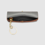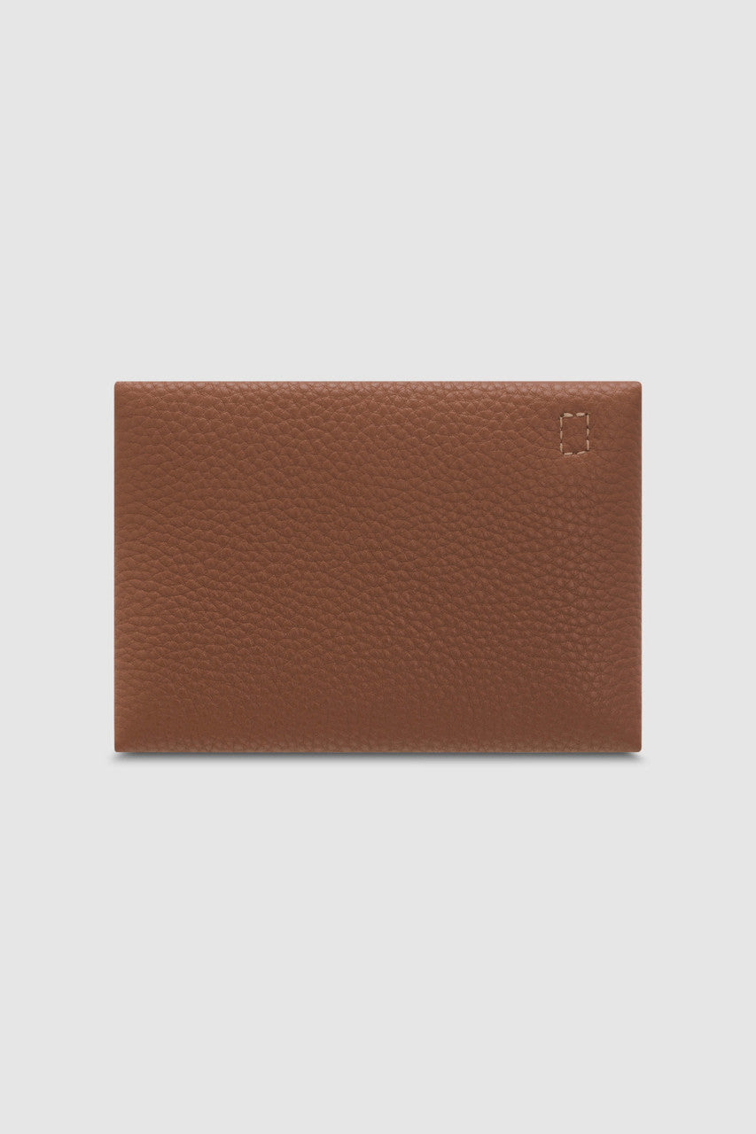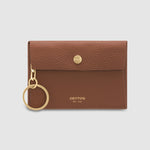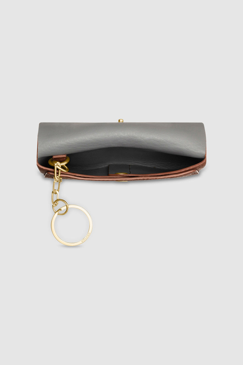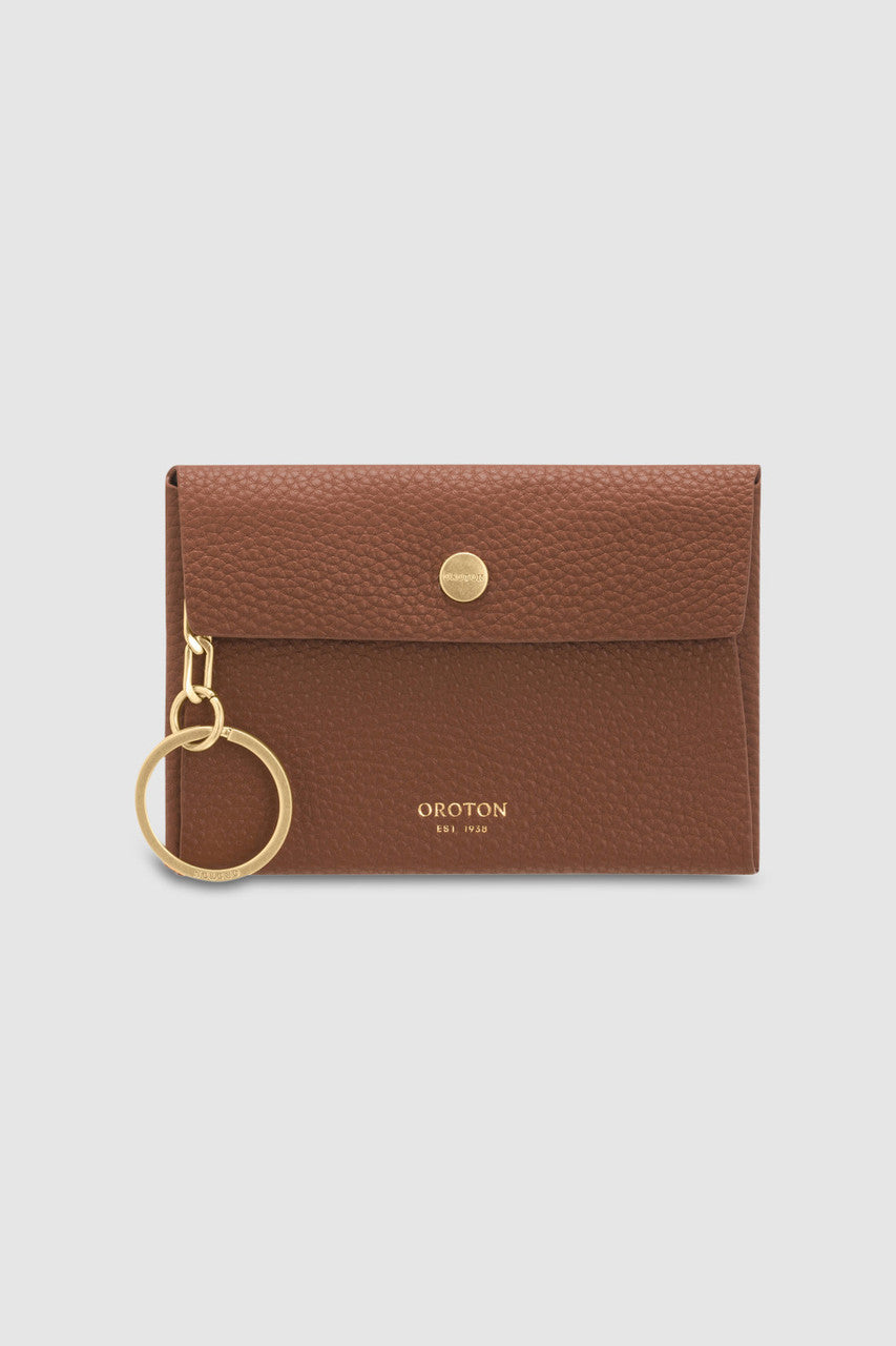 The Oroton Margot Keyring Pouch in Whiskey comprises a sleek and compact design. Open the flap and press stud closure to reveal a small compartment lined in faux leather. A chain and split ring is attached from the interior to securely hold the pouch when attaching it onto your keys or bag zips. Crafted from pebble leather with brass detailing, this is the perfect dainty accessory to gift to her. A foil emboss logo completes the pouch.