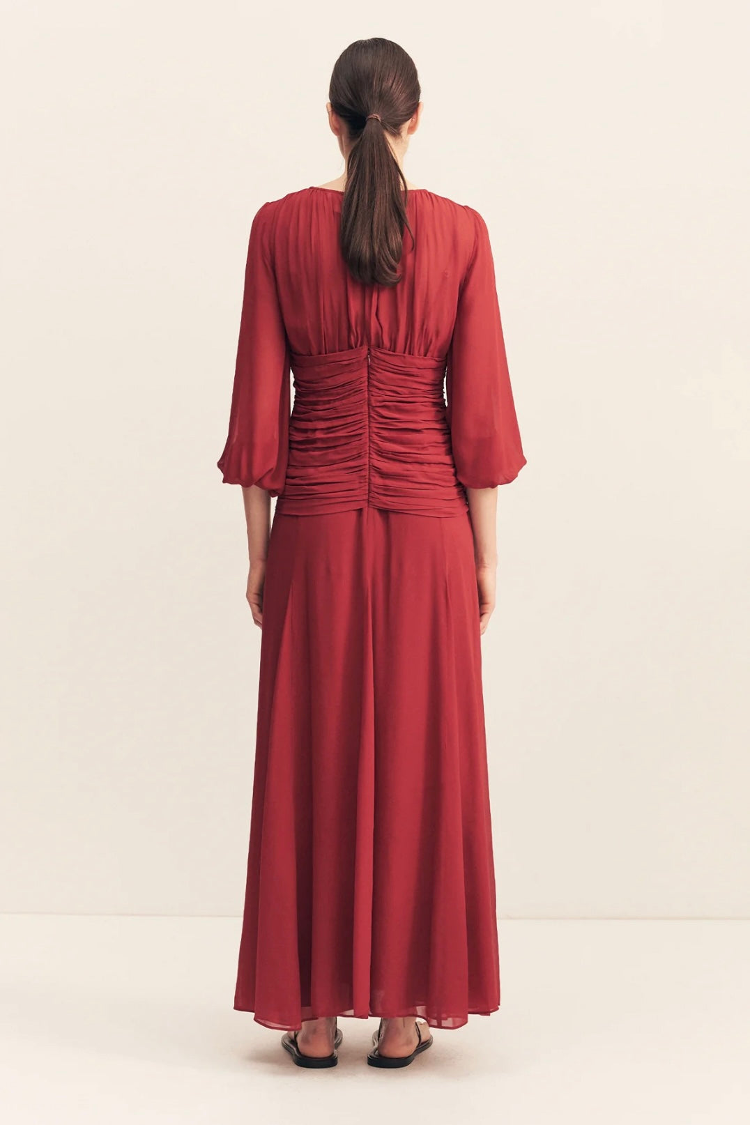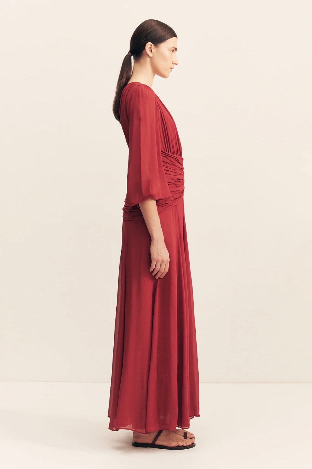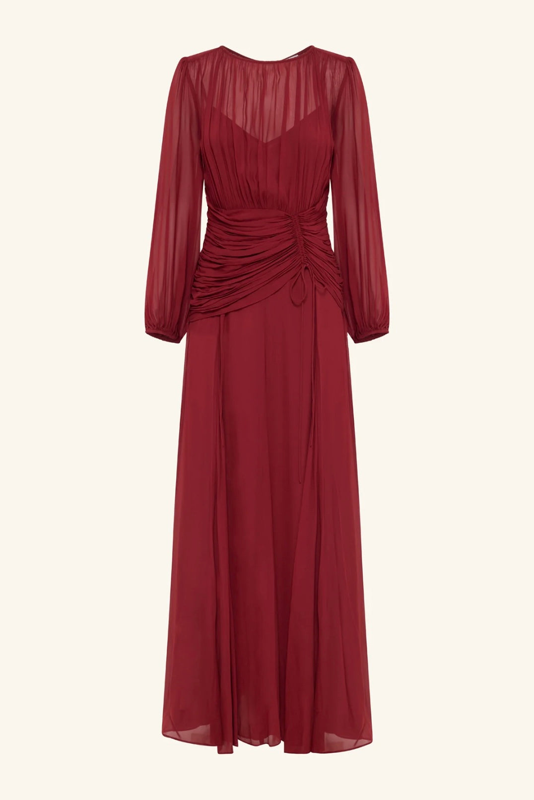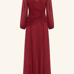 High neck balloon sleeve maxi dress in sangria in a semi-sheer georgette.