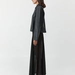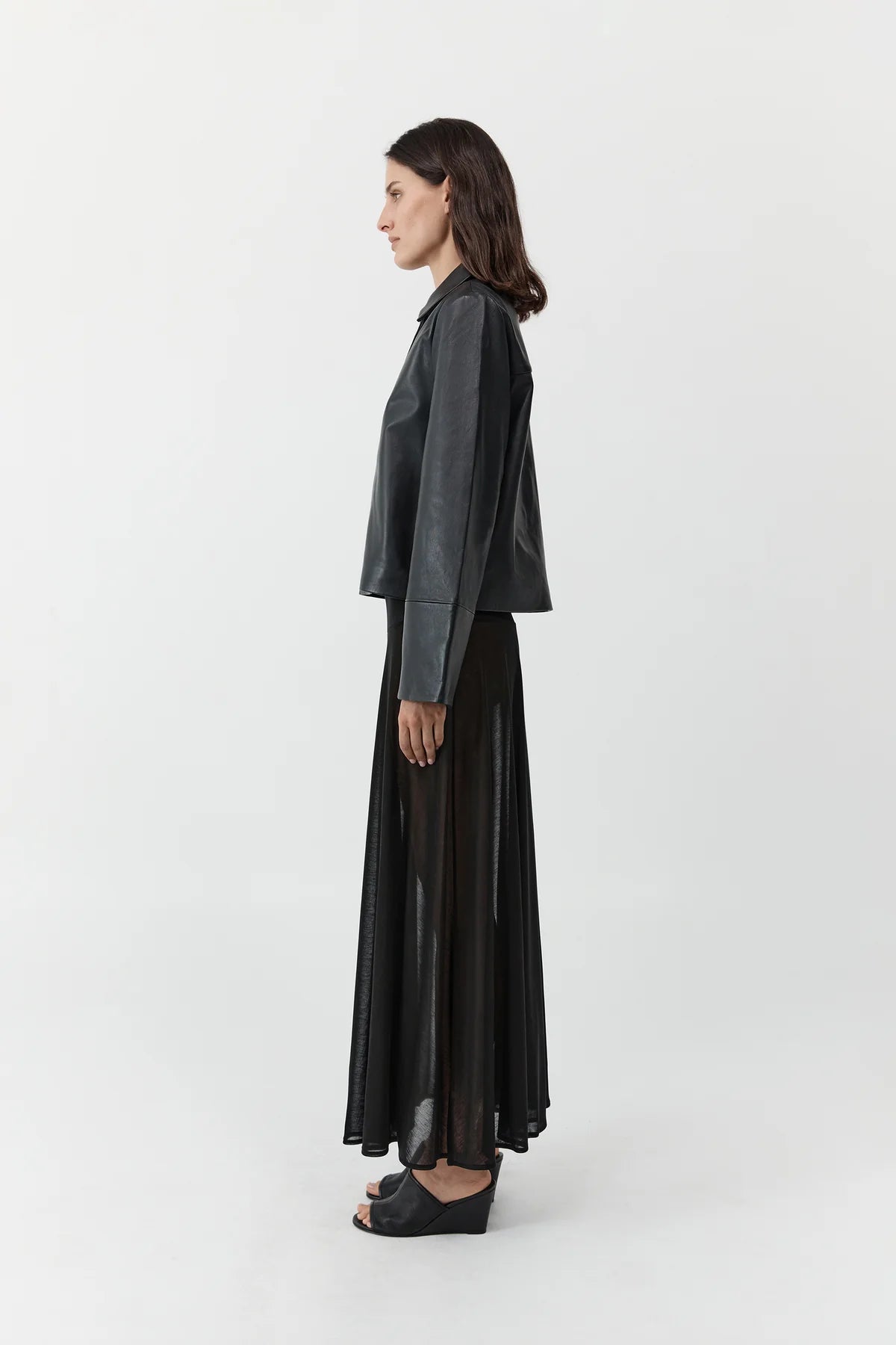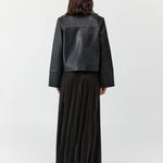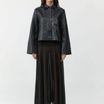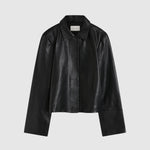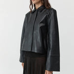 The Leather Minimal Jacket is defined by precise proportions and restrained detailing. Designed with a clean collared neckline, the Leather Minimal Jacket features concealed magnetic buttons for a seamless closure and elongated cuffs that subtly extend the line of the sleeve. Cut in a tailored fit, the Leather Minimal Jacket offers a refined, understated approach to modern outerwear.