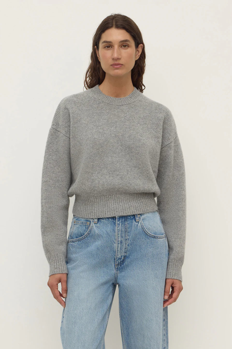 The Benny Knit in breeze is a wool blend knit with a crew neck, ribbed cuffs and trim, and a slightly cropped length.