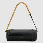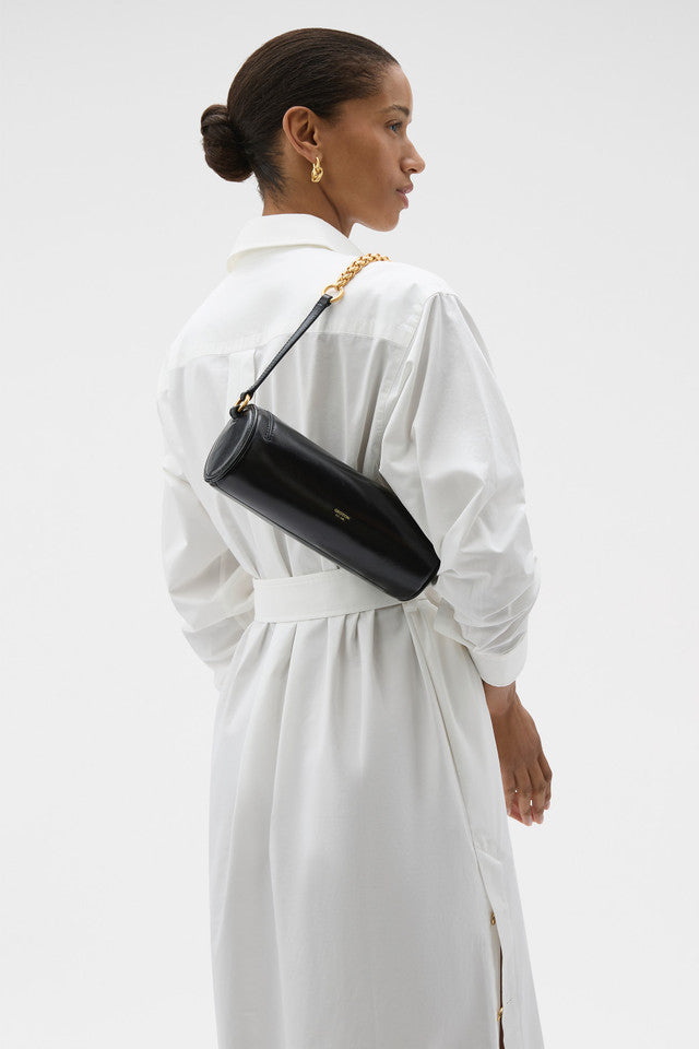 The Romy Barrel Bag is a modern compact silhouette crafted in premium smooth leather. Designed with a top zip closure and foil-embossed logo, it features gold hardware and a removable chain. Wear crossbody, on the shoulder or as a wristlet for day-to-evening versatility.