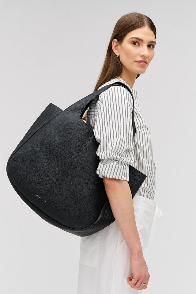 Elevate your everyday look with the Emilia Large Tote Bag. Crafted from luxe pebble leather, this bag combines elegance with practicality. Featuring a secure zip closure, front and back slider pockets, and interior organisation, it's perfect for the modern, stylish individual. Padded shoulder straps ensure comfort, while brass hardware and a foil embossed logo add a touch of sophistication.