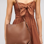 - Back internal has a faux pebble leather slider pocket and divider pocket