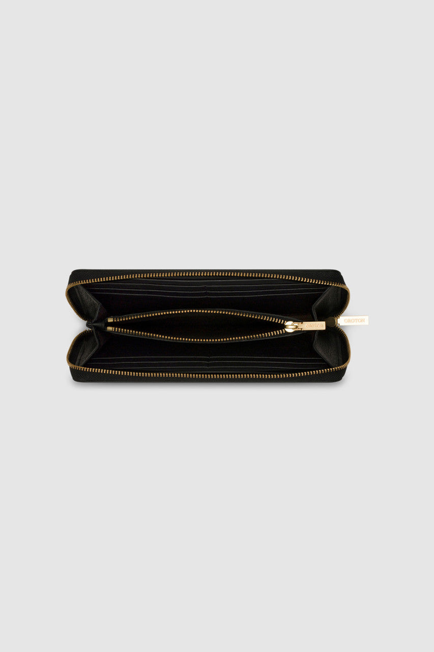 The Oroton Margot Medium Zip Around Wallet. This sophisticated wallet is crafted from premium pebble leather, offering both durability and style. With its sleek zip-around closure, you can trust that your essentials will stay secure. Inside, you'll find two spacious main compartments, along with an internal zip coin pocket, two note pockets, and 12 credit card slots. The wallet is lined with 100% cotton twill, providing a soft and luxurious touch. Adorned with a foil embossed logo and complemented by brass colour hardware, this wallet exudes elegance. Perfect for all occasions, this black wallet is designed to keep you organized and stylish throughout the day.