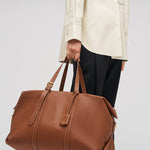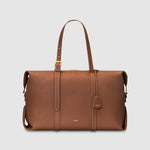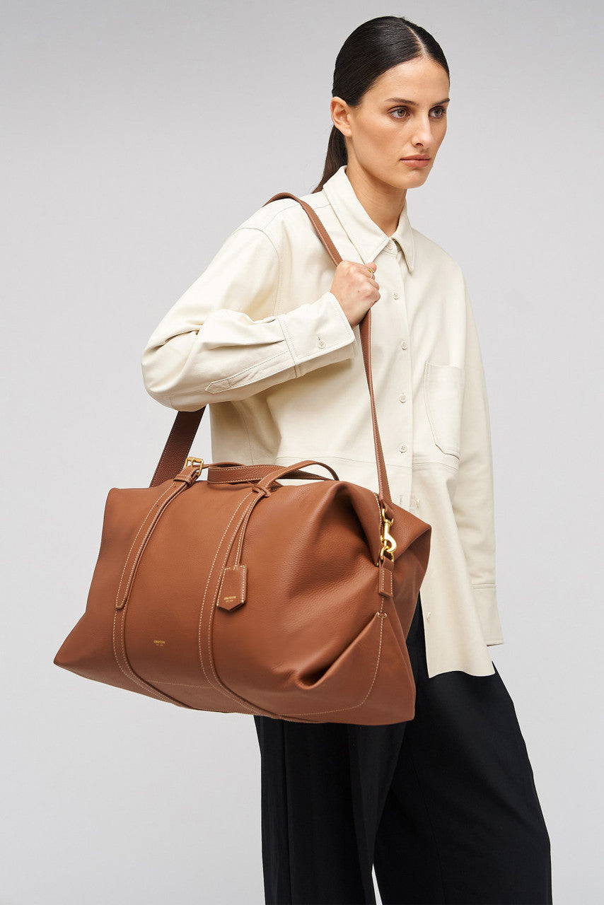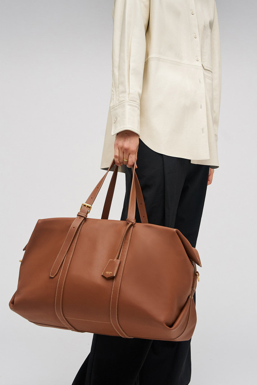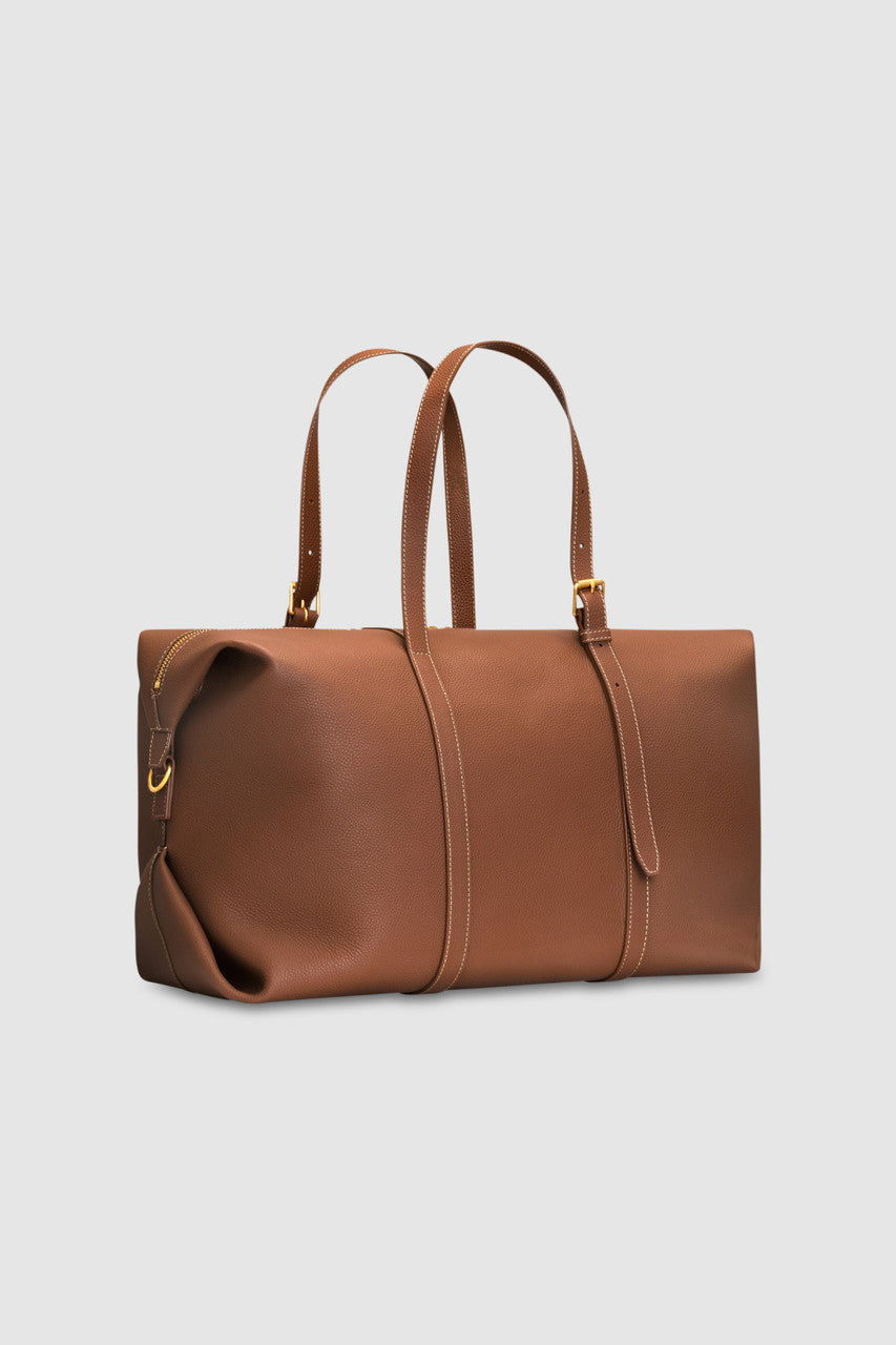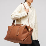 The Margot Weekender is crafted from a combination of pebble leather and accents of brass colour hardware. This spacious bag is perfect for holding all of your travel essentials. It unzips to reveal one main compartment with two slider pockets. Wear the bag on your shoulder with the adjustable and removable crossbody strap, or elegantly hold the adjustable top handles.