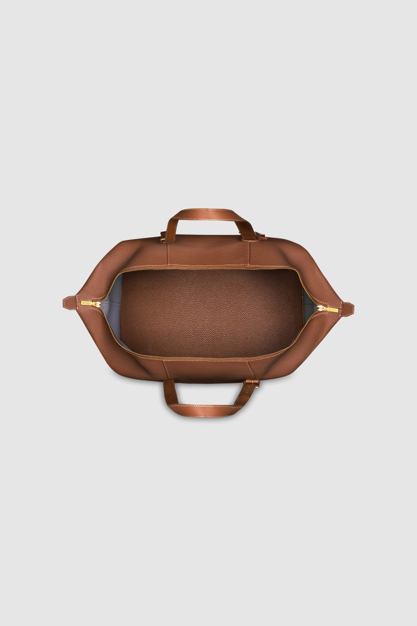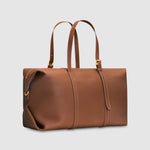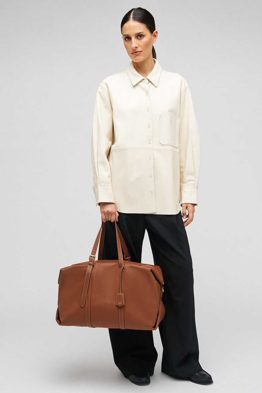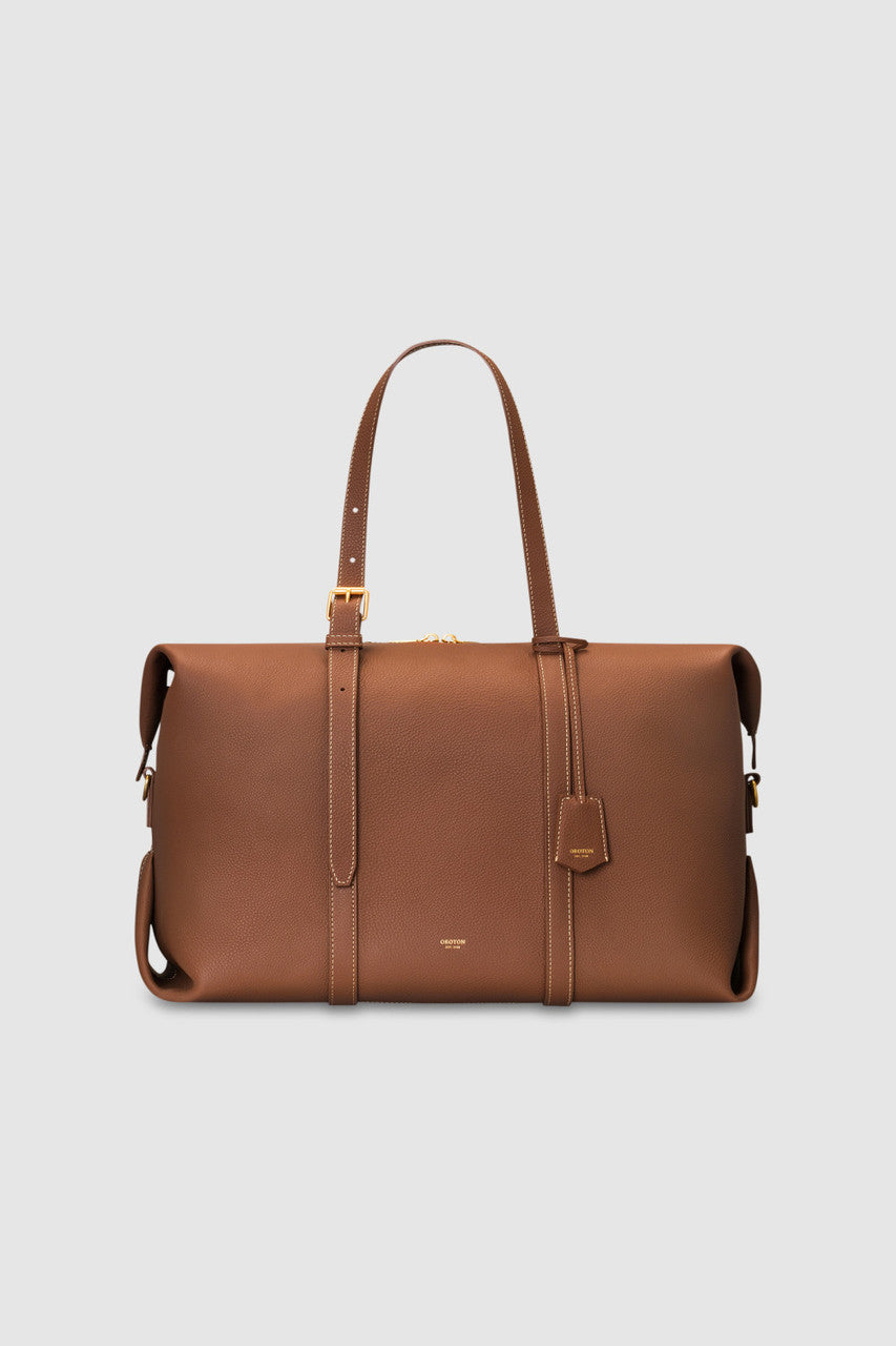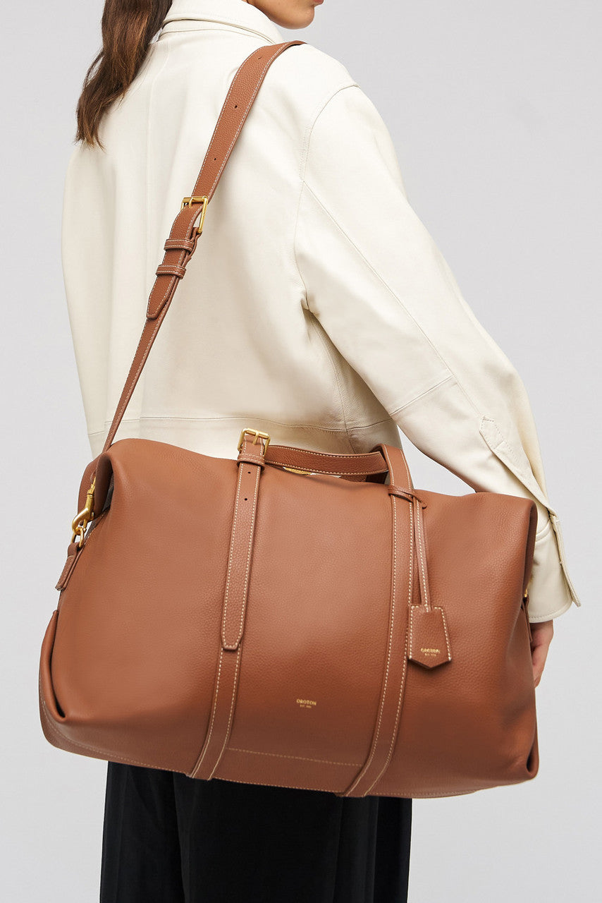 The Margot Weekender is crafted from a combination of pebble leather and accents of brass colour hardware. This spacious bag is perfect for holding all of your travel essentials. It unzips to reveal one main compartment with two slider pockets. Wear the bag on your shoulder with the adjustable and removable crossbody strap, or elegantly hold the adjustable top handles.